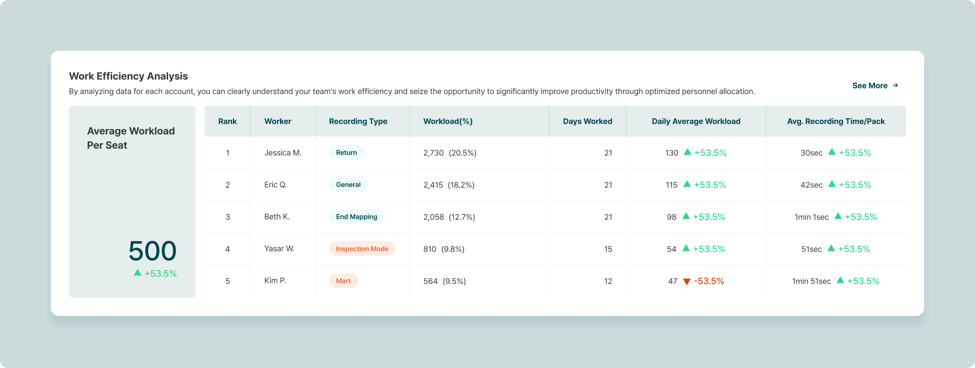 Clearly understand the team’s work efficiency and optimize workforce allocation through data analysis by each worker.