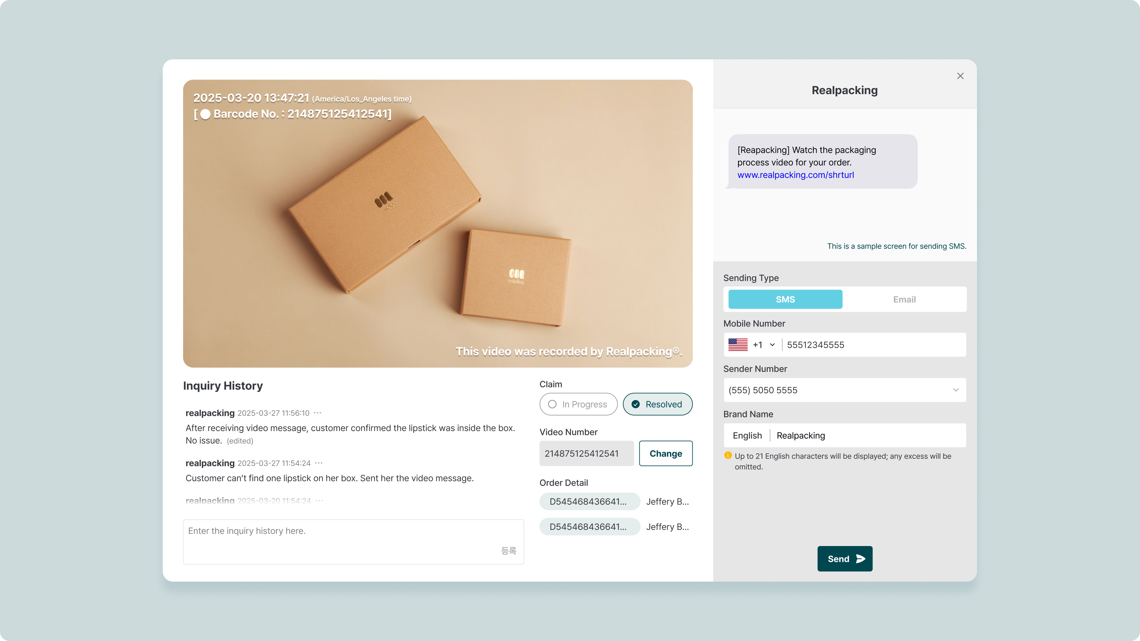 Video Recording List, it's possible to register a claim (Inquiry History) for a video or send it to a customer. Check the details on how to send the video to a customer on the Send Individual Video Message page.