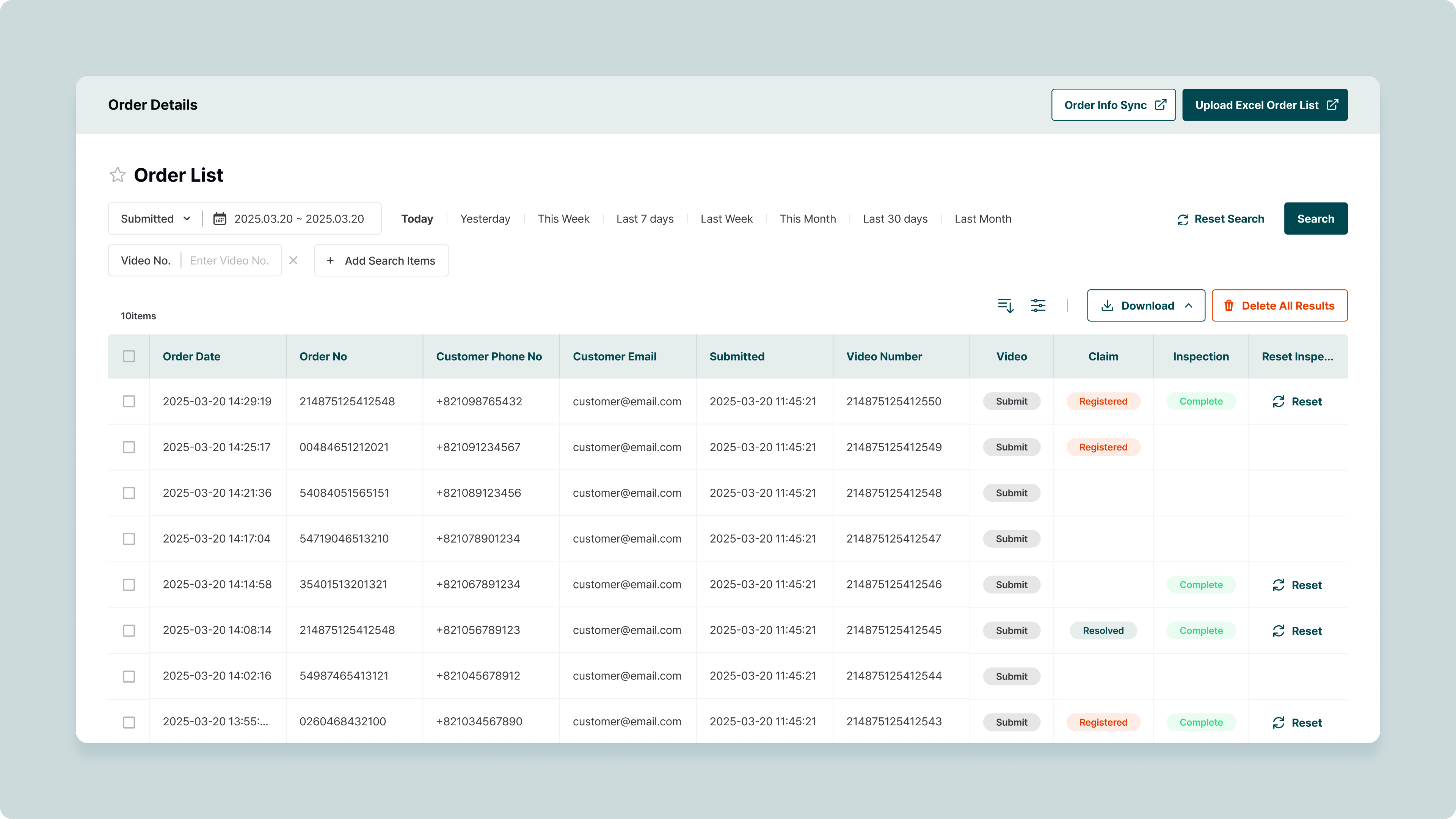 downloadfunction, it's possible to download the video list or inspection results as an Excel file.Order information can be deleted by clicking
