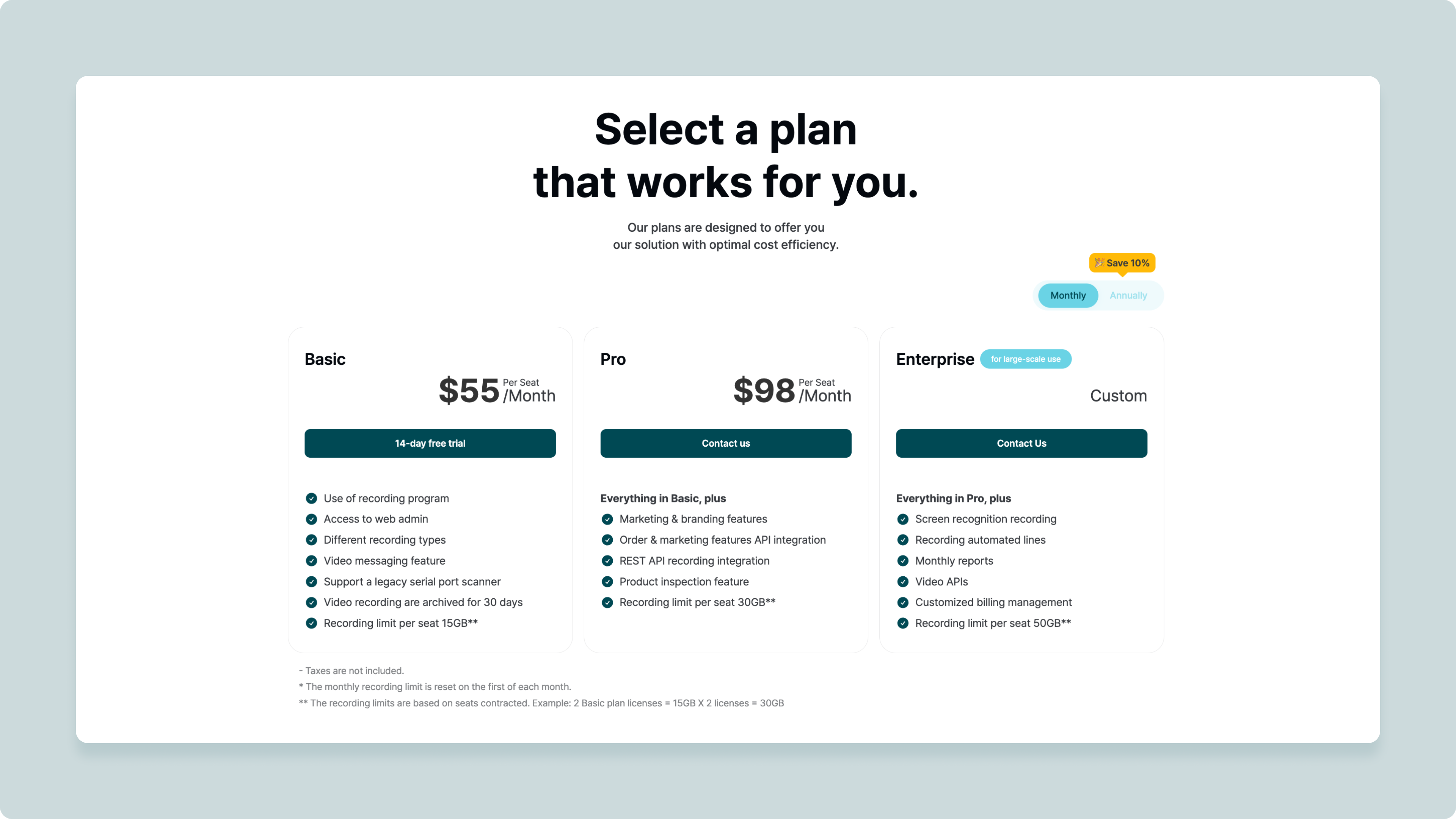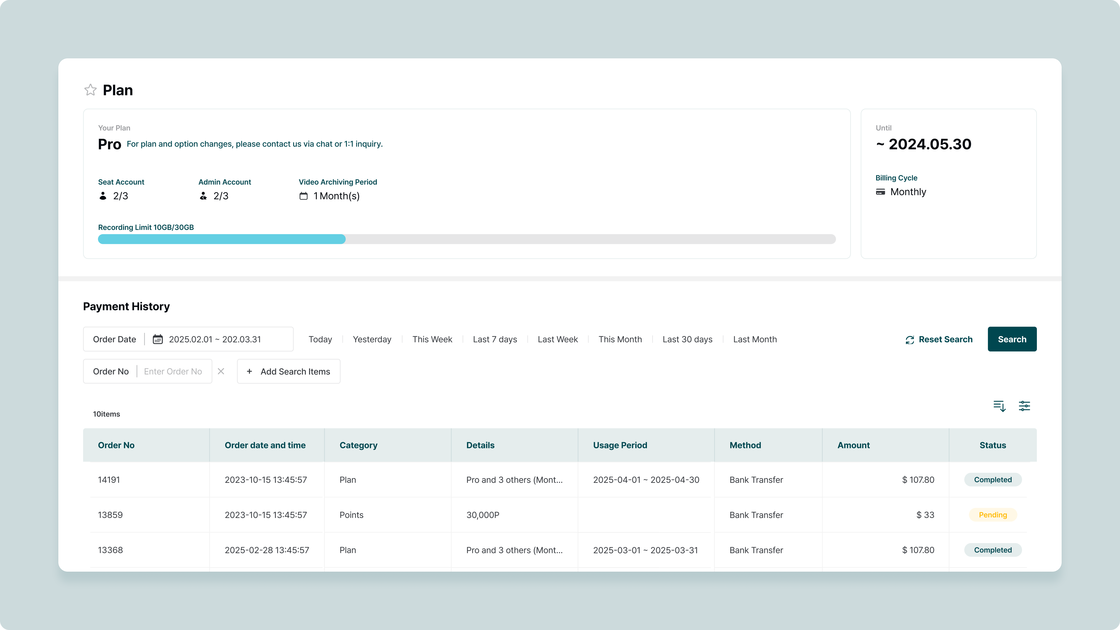 Video Archiving Period | One month is provided for free. Extend the video storage period by adding additional months to store and manage your videos for the desired duration. |