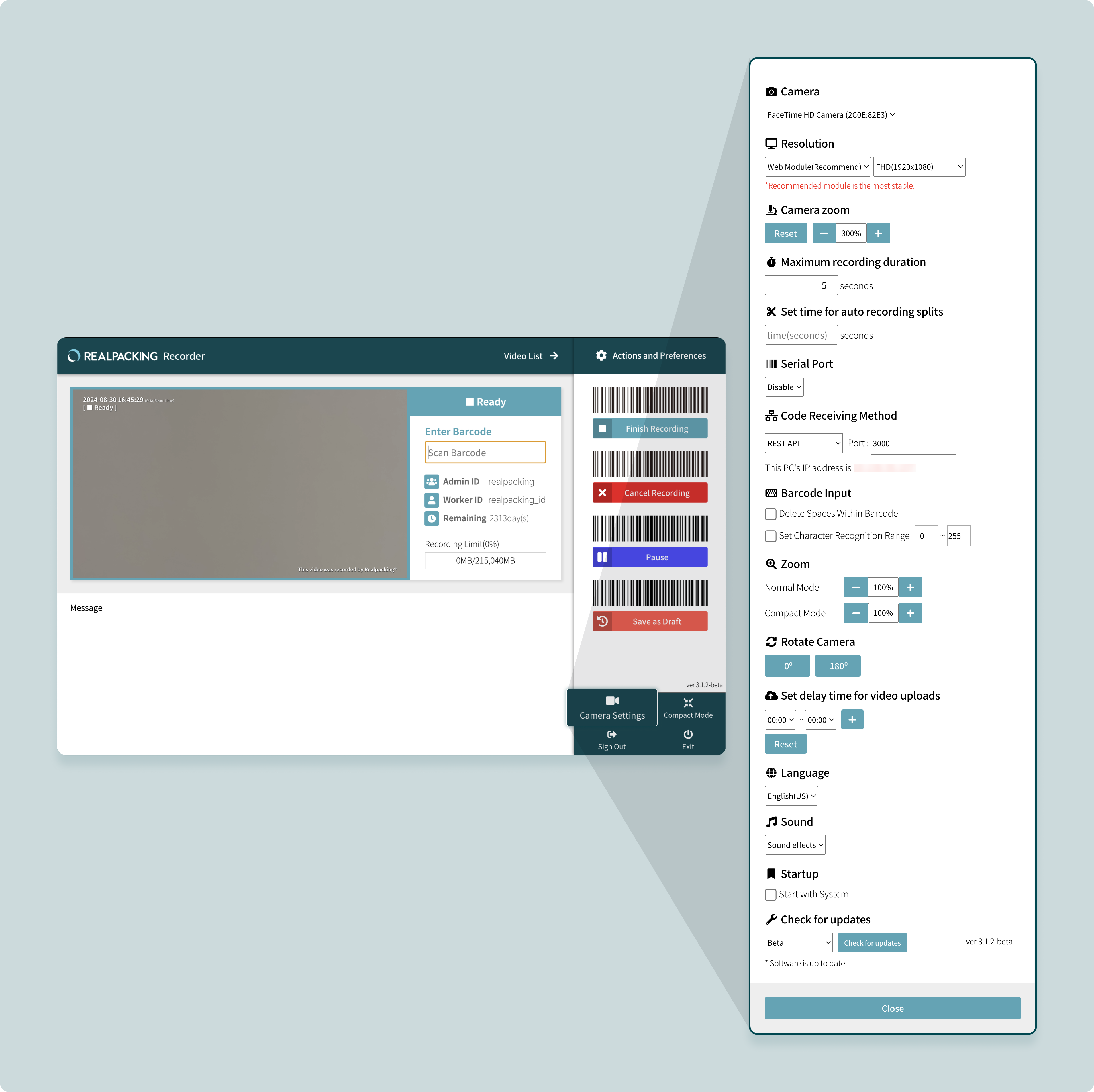 Set delay time for video uploads | A hold time for the video to be sent to the Realpacking server. |