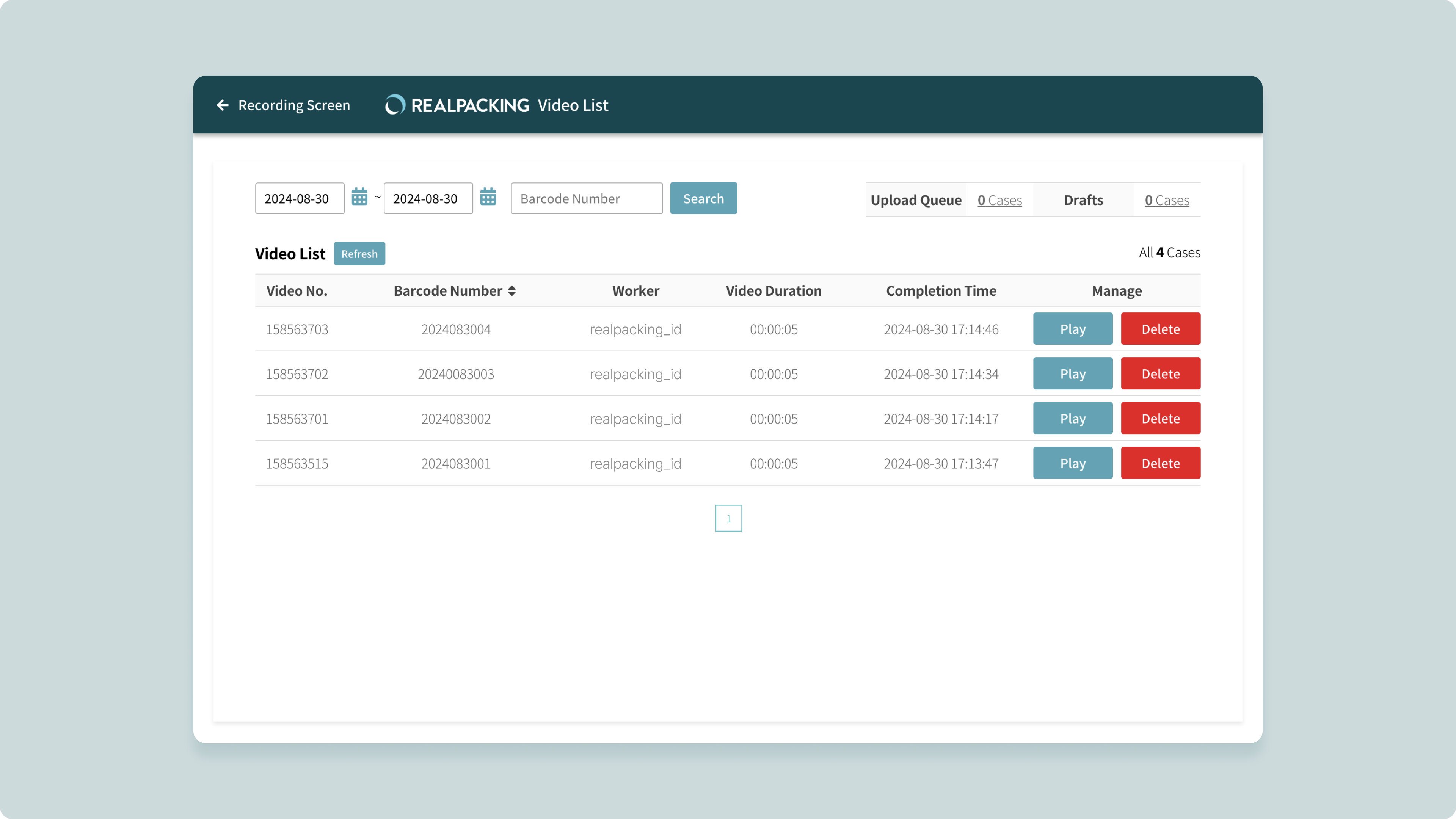 Videos recorded in the Realpacking Recorder can be reviewed in the Video List.