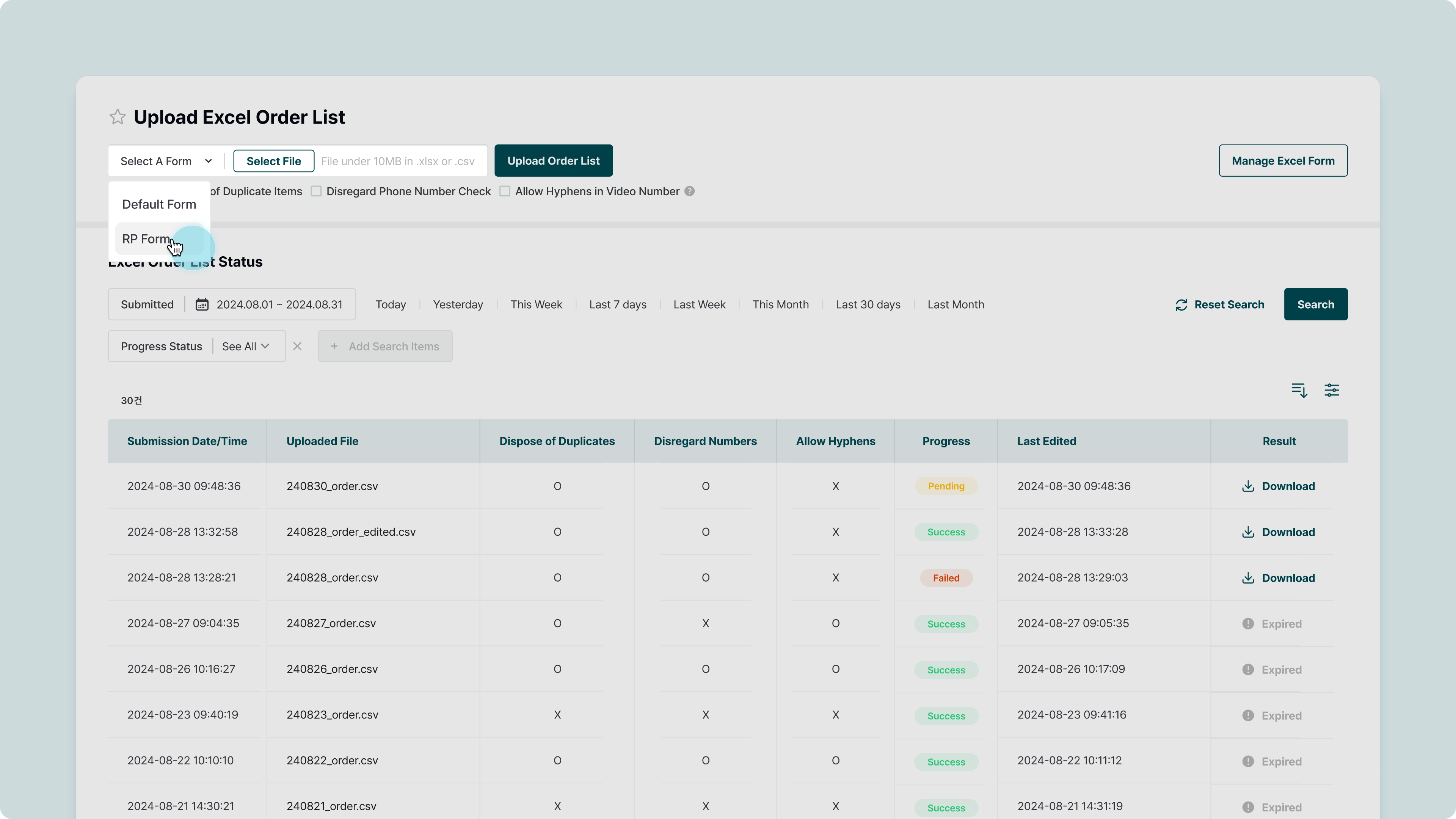 If the order information is not visible, download the Result file from the Excel Order List Status to check for errors. After correcting the errors in the file, upload it again.