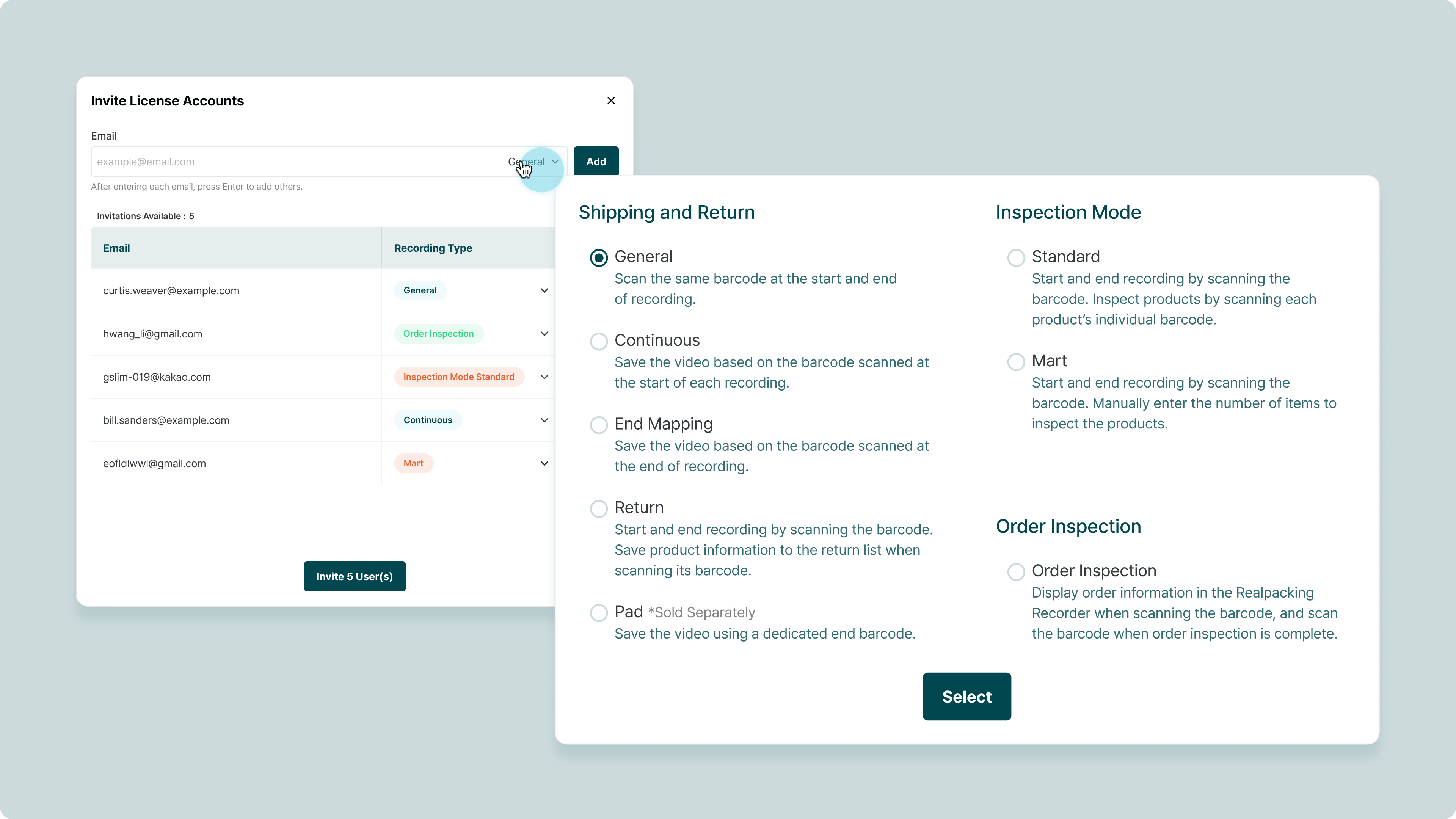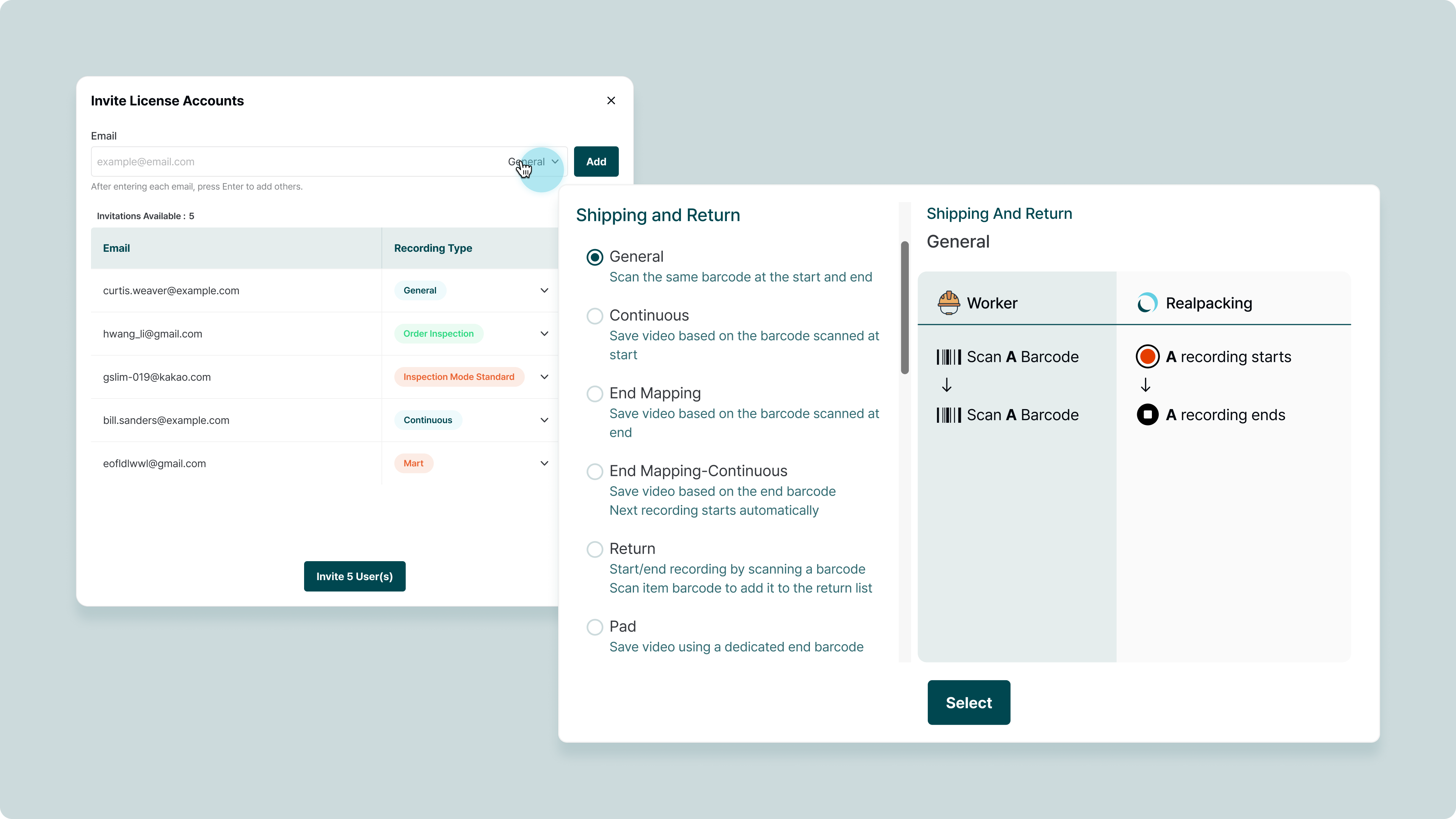 Enter the email to be invited and select the type of recording. The workspace owner can invite multiple users at once.