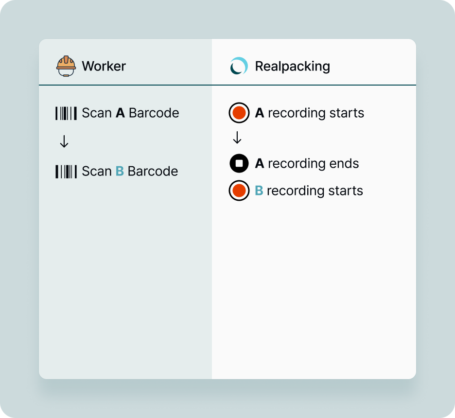 Scan Barcode A > Start recording > Scan Barcode B > Ends recording for A and starts recording for B