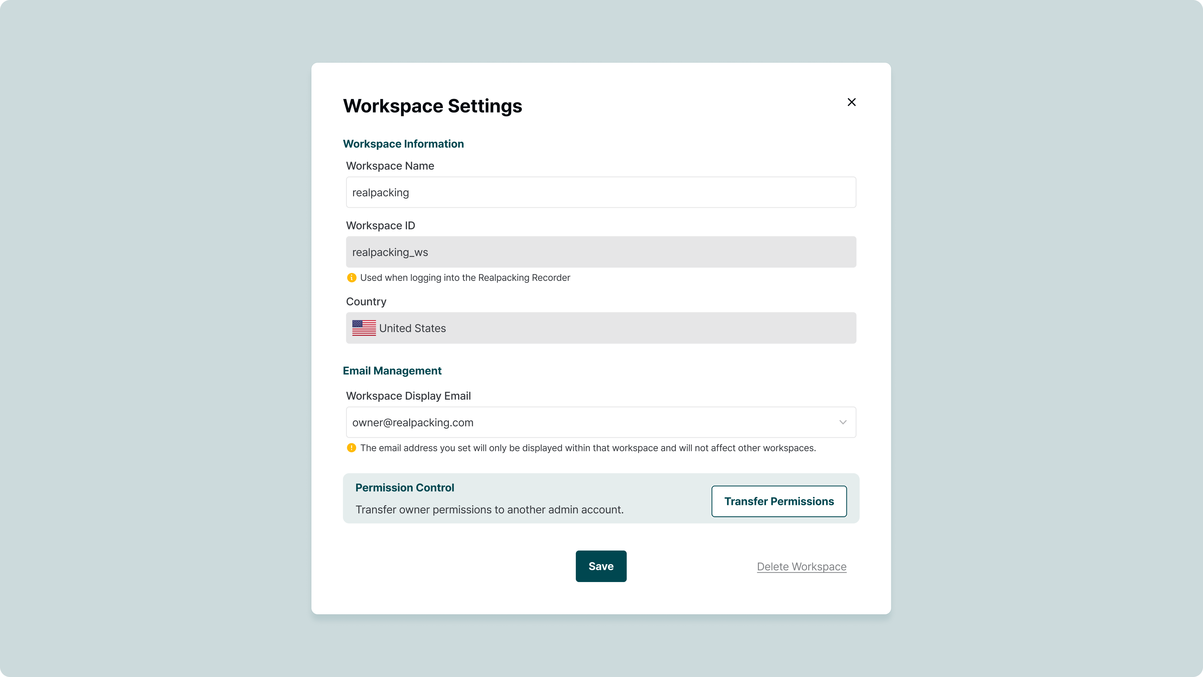 Email Management | The email address set will only be displayed within that specific workspace and will not affect other workspaces. |