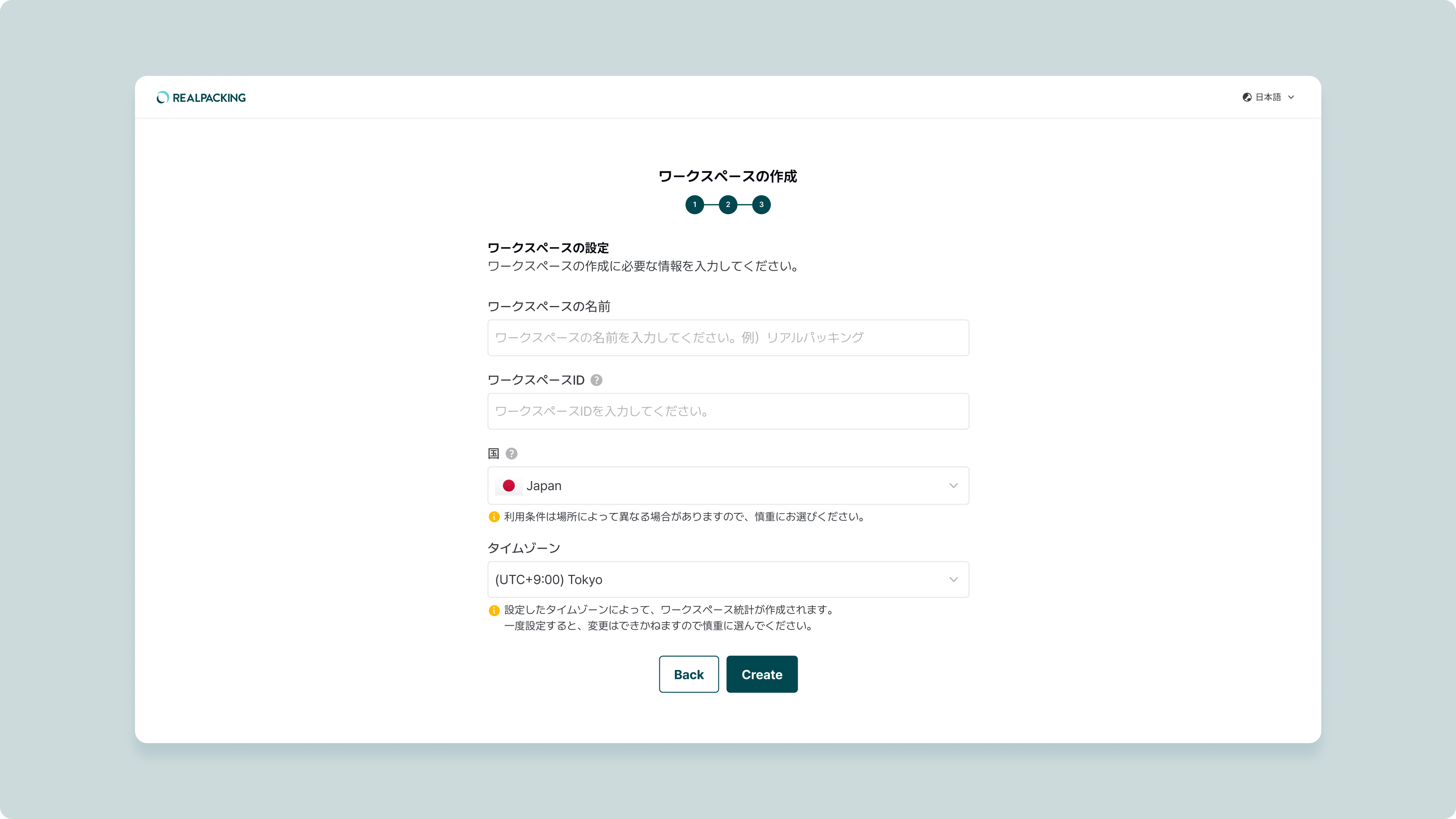 設定したタイムゾーンによってワークスペースの統計が作成されます。タイムゾーンの設定は、ワークスペースの作成時のみに利用でき、タイムゾーンによって決済情報と統計が作成されますので、慎重に選択してください。