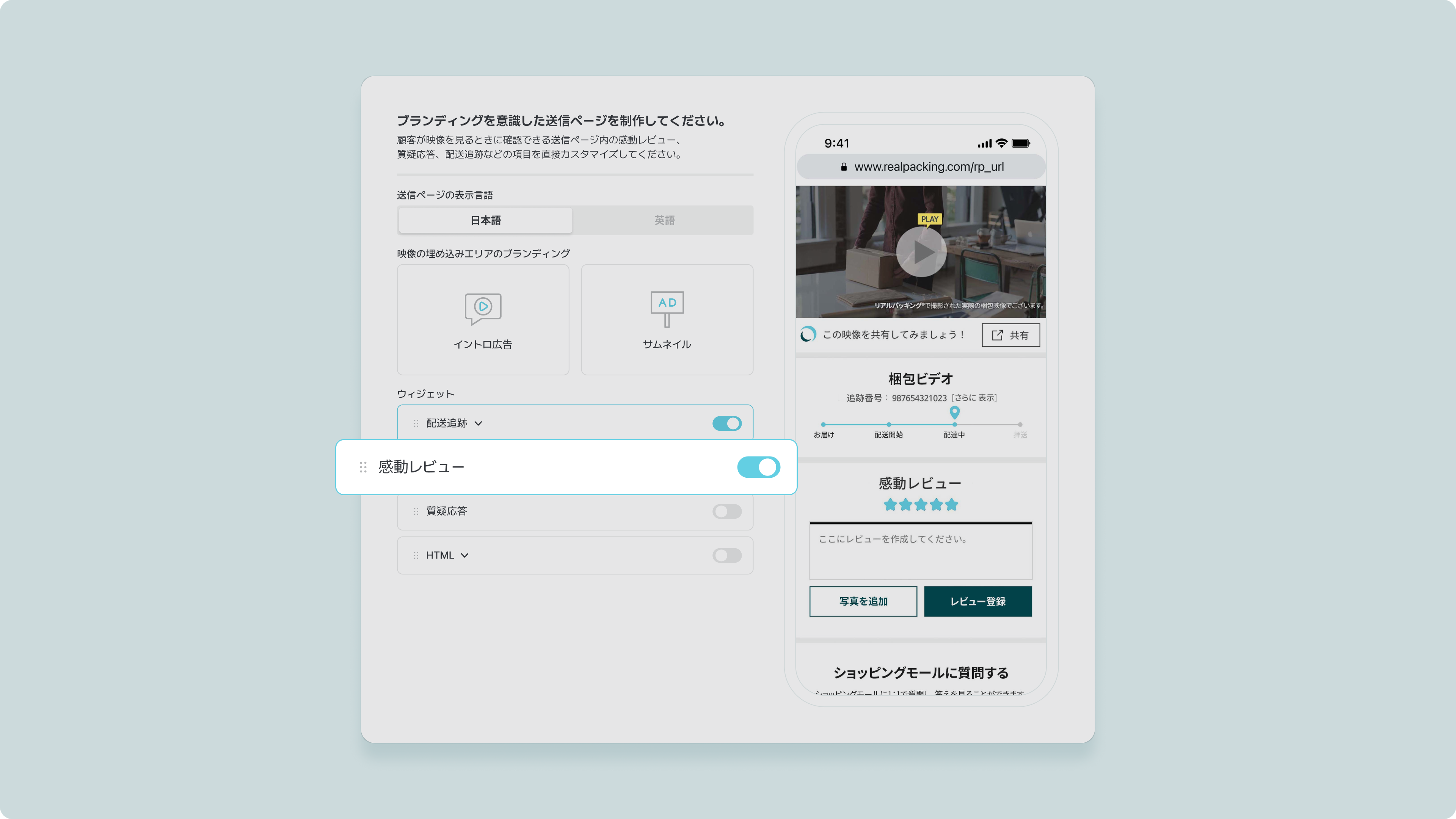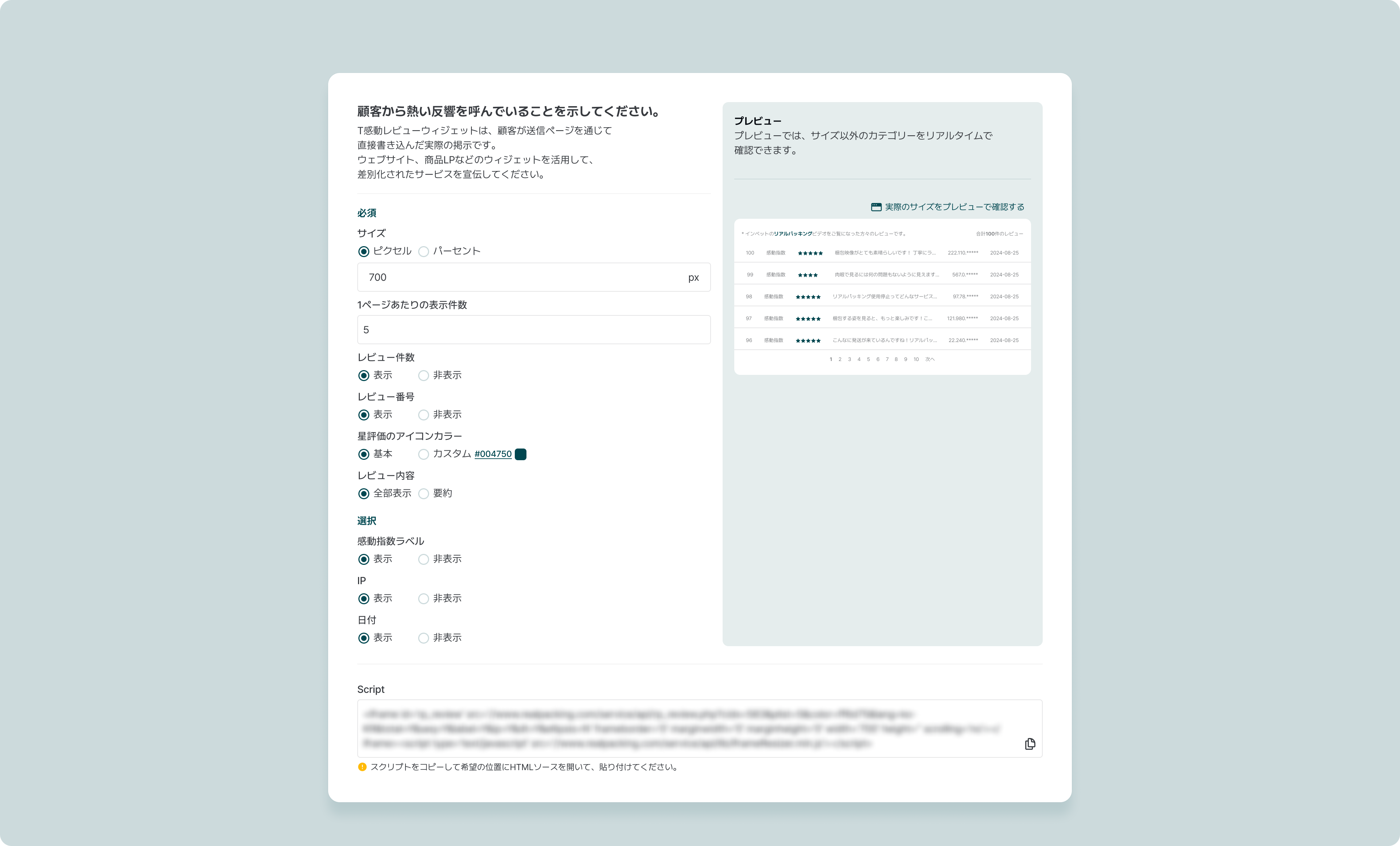 送信ページに、感動レビューウィジェットを付けることで、お客様が直接口コミを投稿することができます。ウェブサイト、商品詳細ページなどのウィジェットを活用して、差別化されたサービスを宣伝してください。