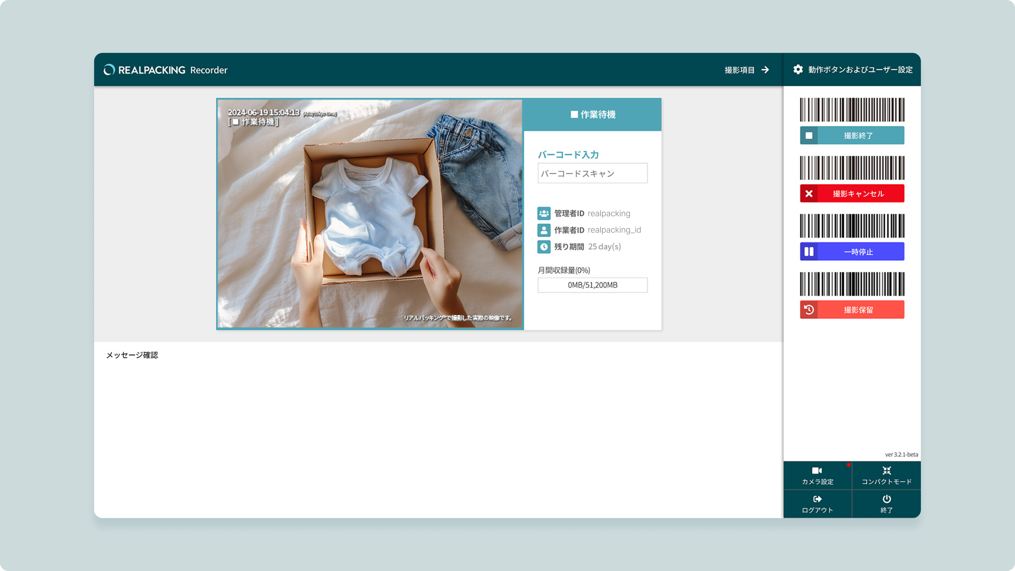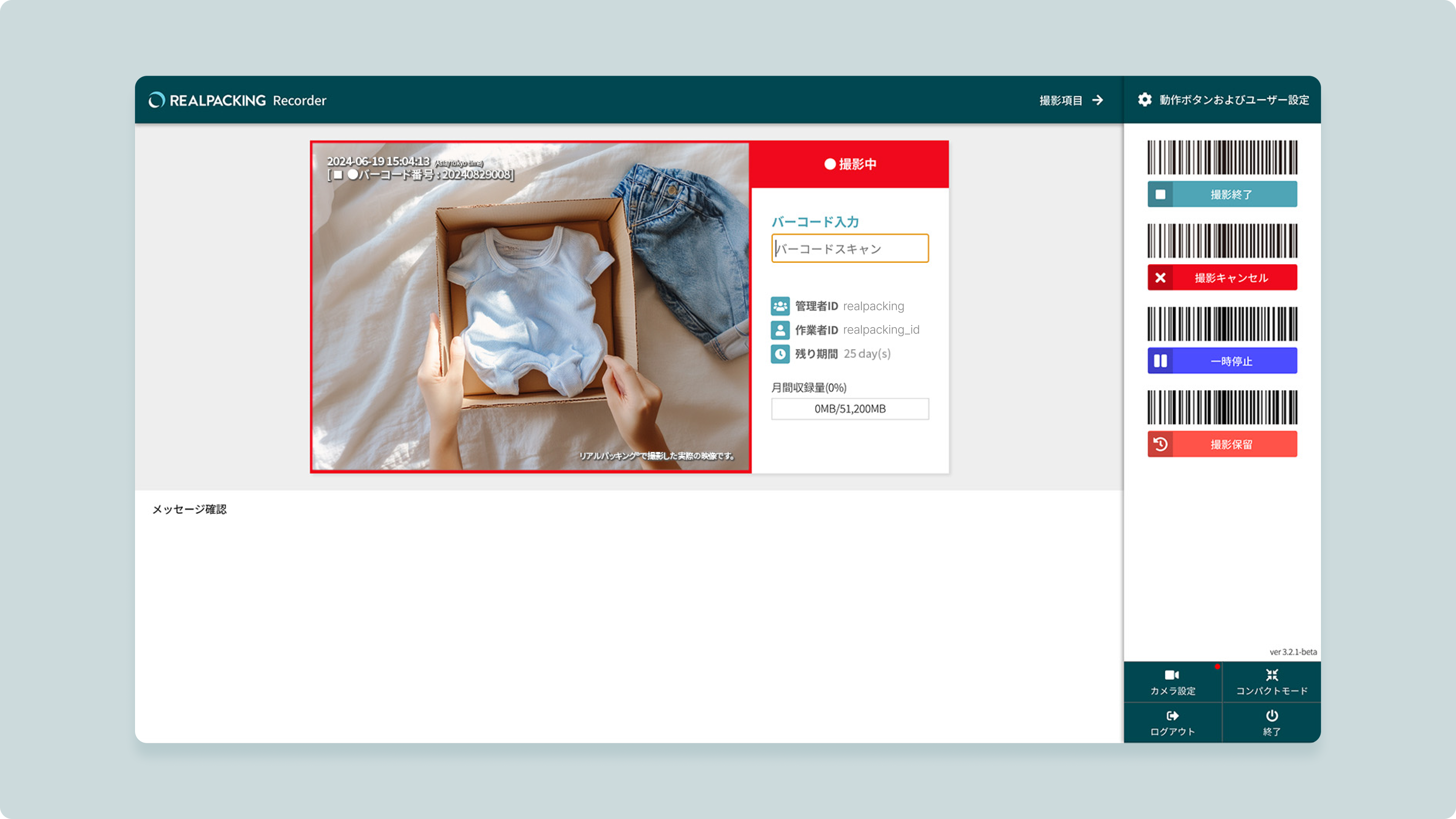 3. バコードスキャナーで送り状のバコードをスキャンすると、撮影プログラムは開始という音声と共に、撮影中(赤い色)のステータスに変更され、実際に撮影が開始されます。