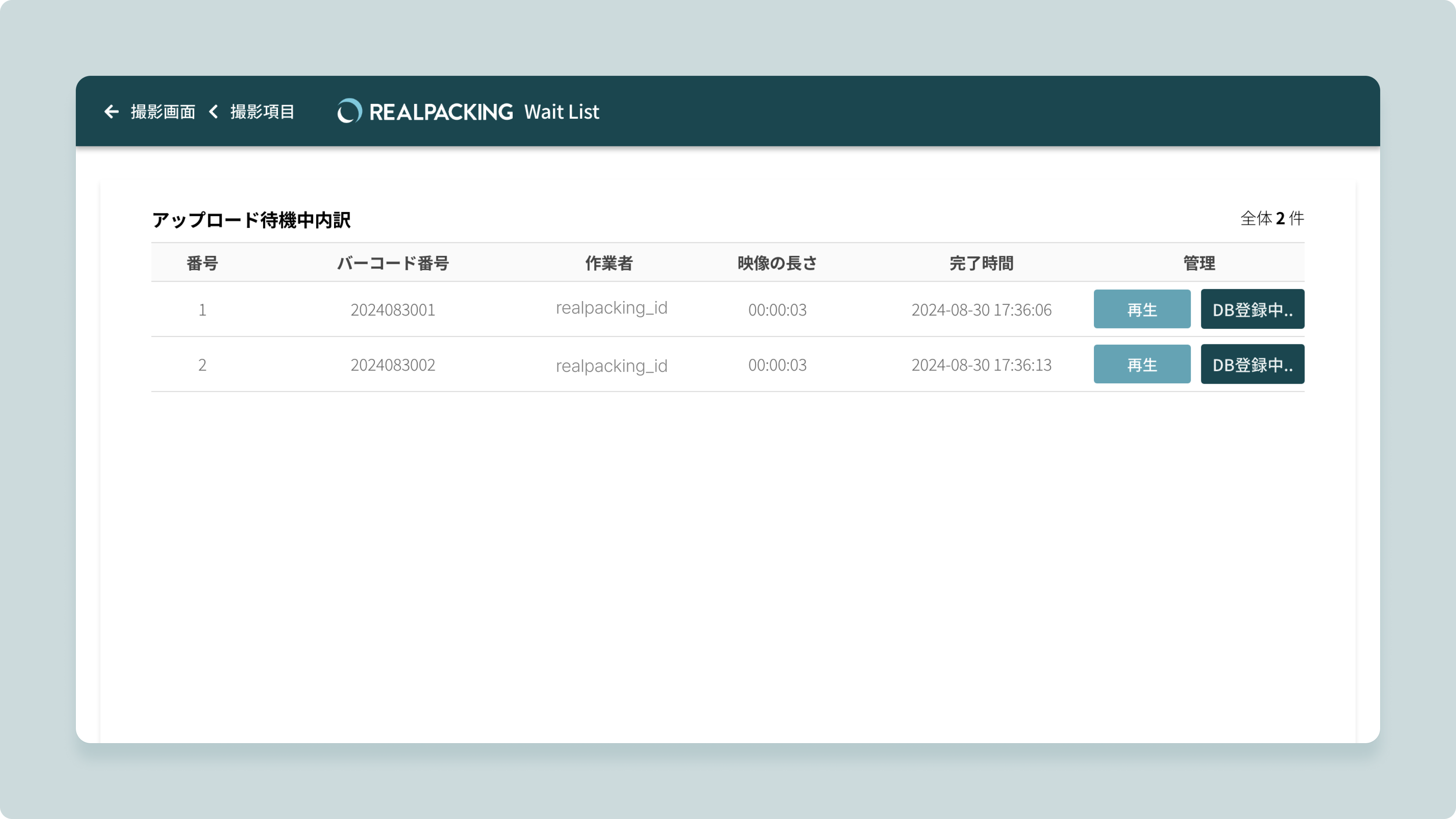 1. 保存された映像がサーバーに登録されると、この注文件の梱包映像の撮影が完了します。
