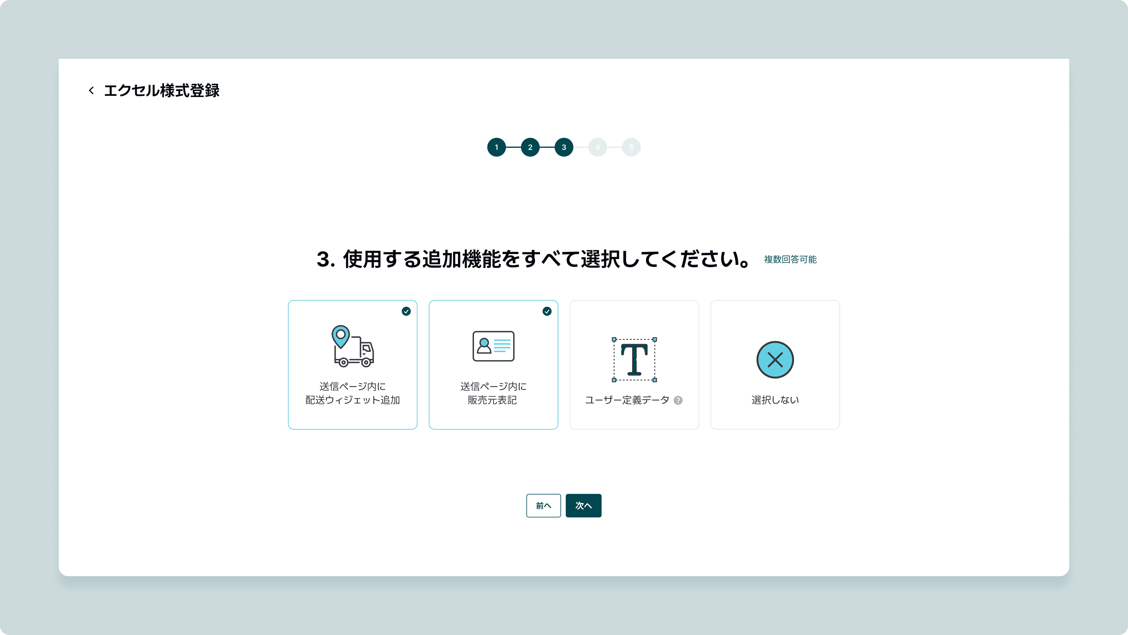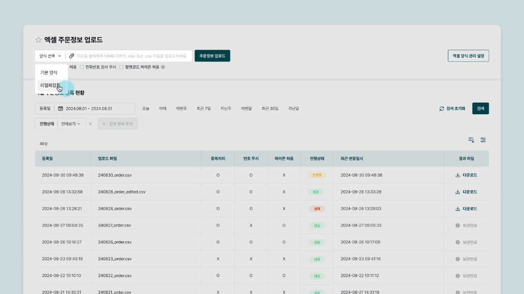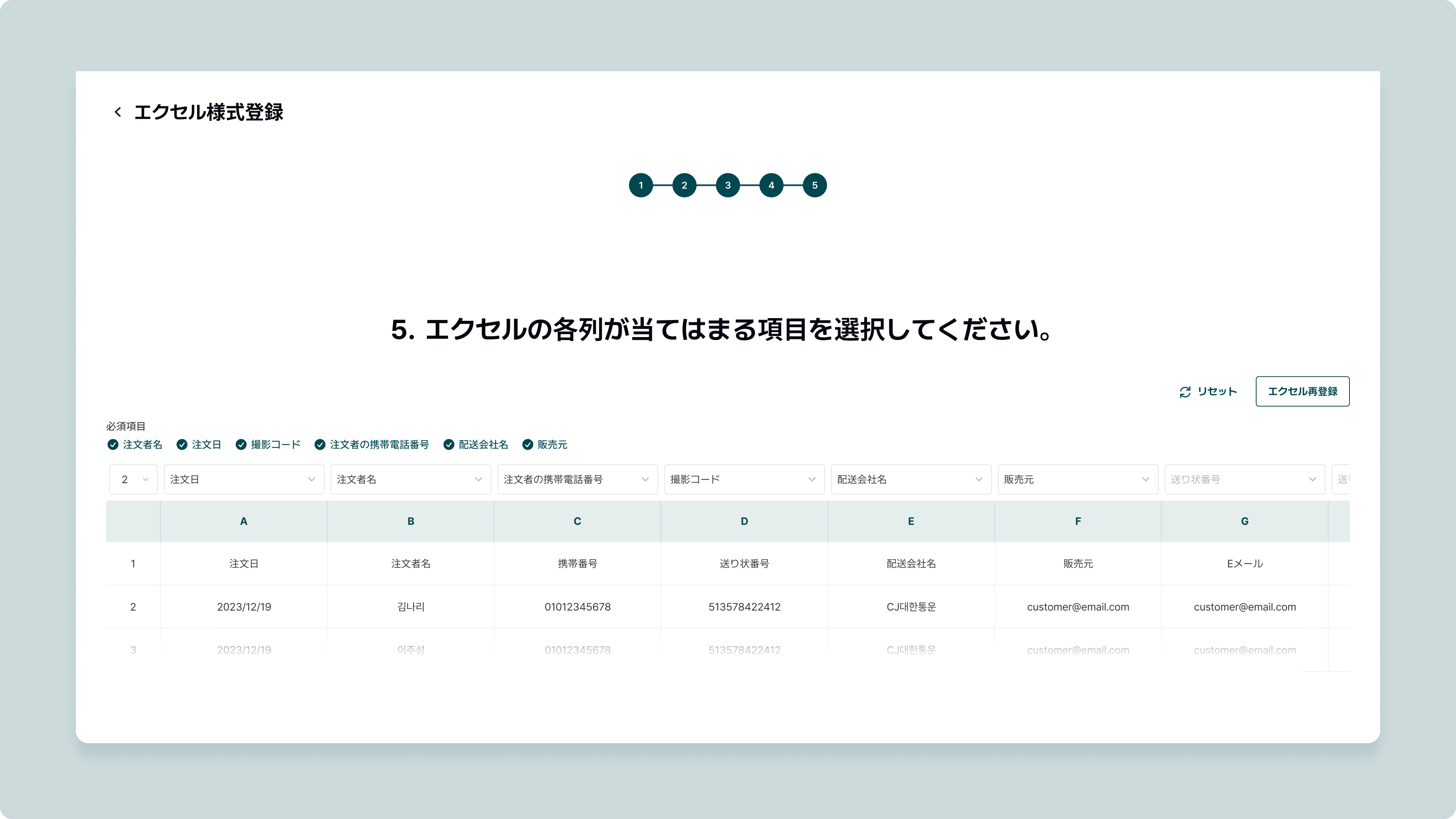 オプションの選択後、画面に表示された必須項目がすべて含まれた注文情報ファイル(xlsxまたはcsv形式)を作成し、ファイルをアップロードします。