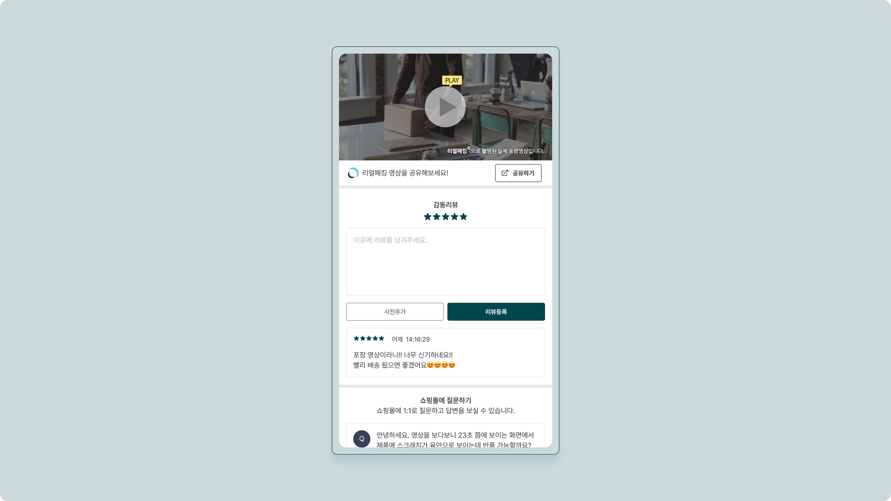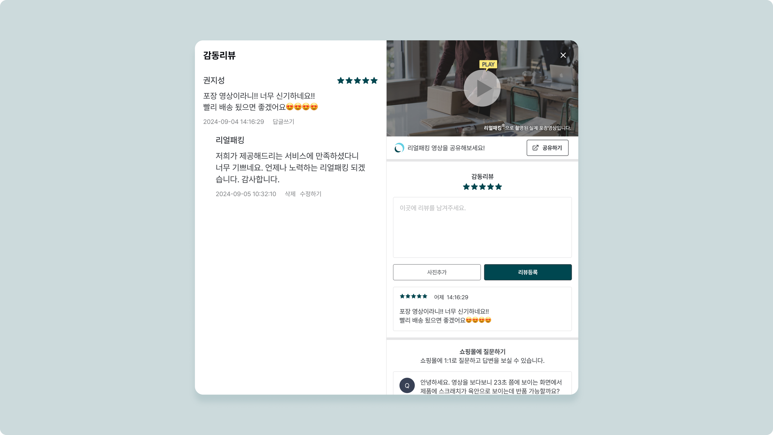 답글쓰기에서 고객의 리뷰에 답글을 작성합니다.고객에게는 우측의 화면과 같이 보여집니다.