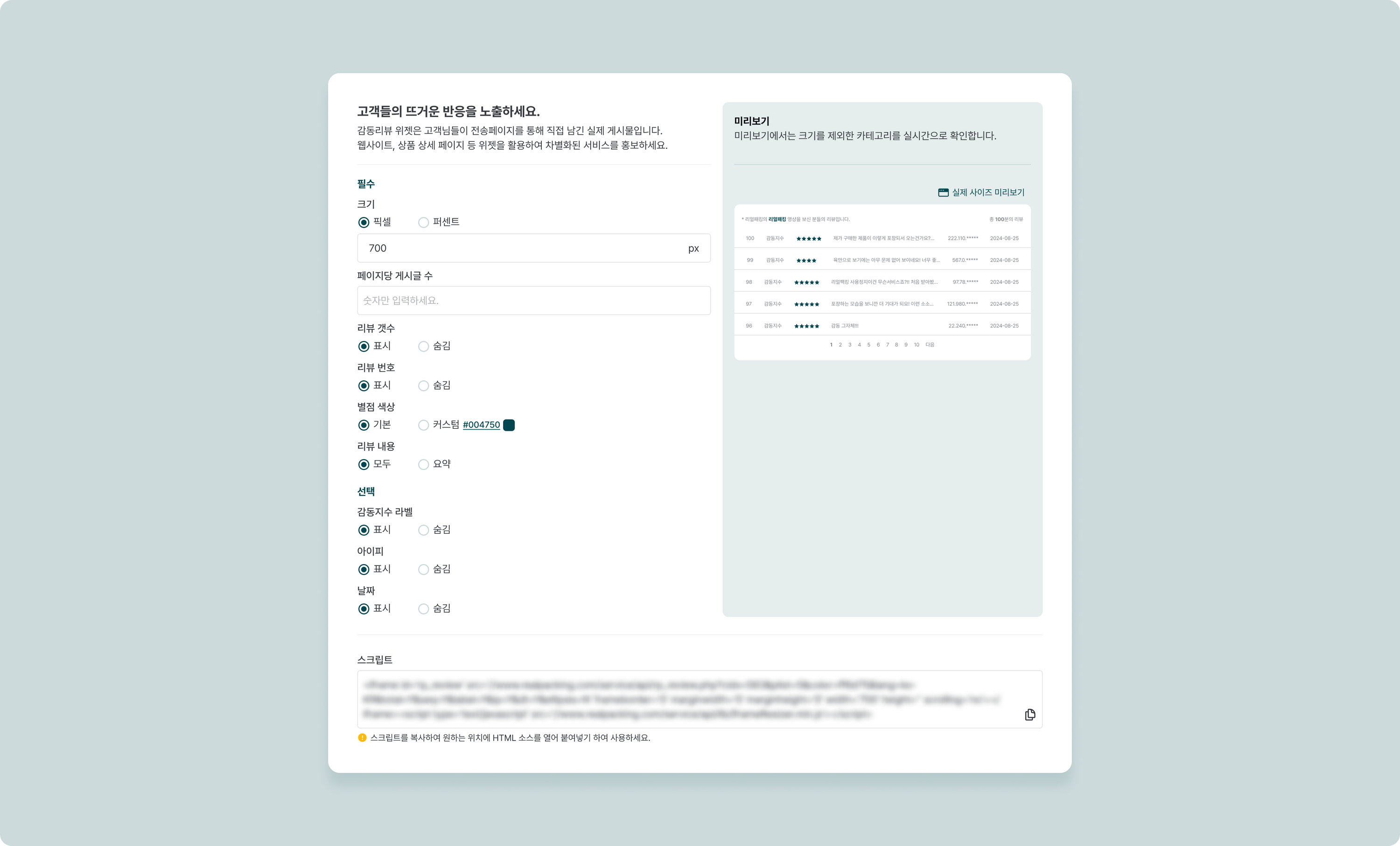 자사 홈페이지, 상품 상세 페이지에 고객 반응 노출 등 다양한 곳에서 고객이 리뷰를 확인할 수 있도록 활용이 가능합니다.