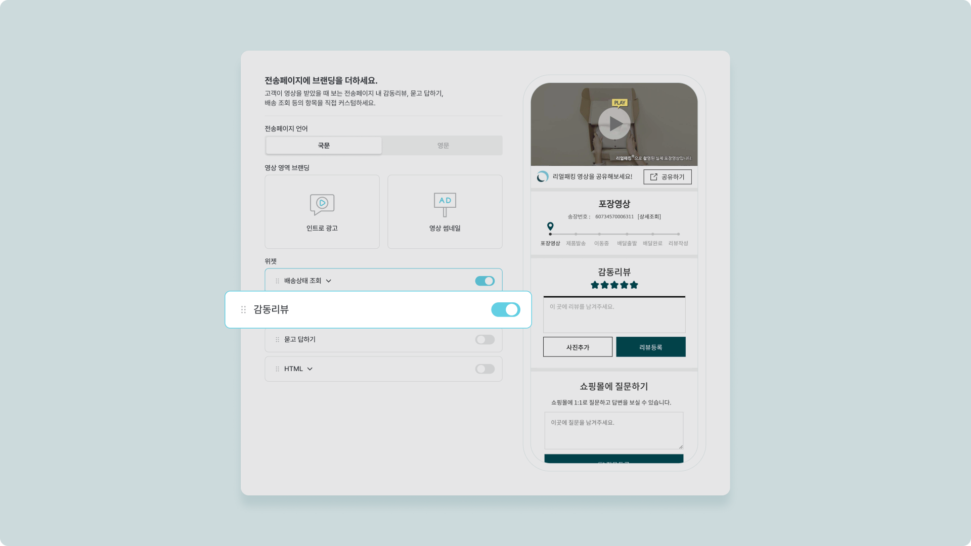 설정→전송페이지 커스터마이징에서 감동 리뷰 노출을 설정합니다. 전송페이지 미리 보기에서 실제 고객에게 보여지는 감동 리뷰를 확인합니다.