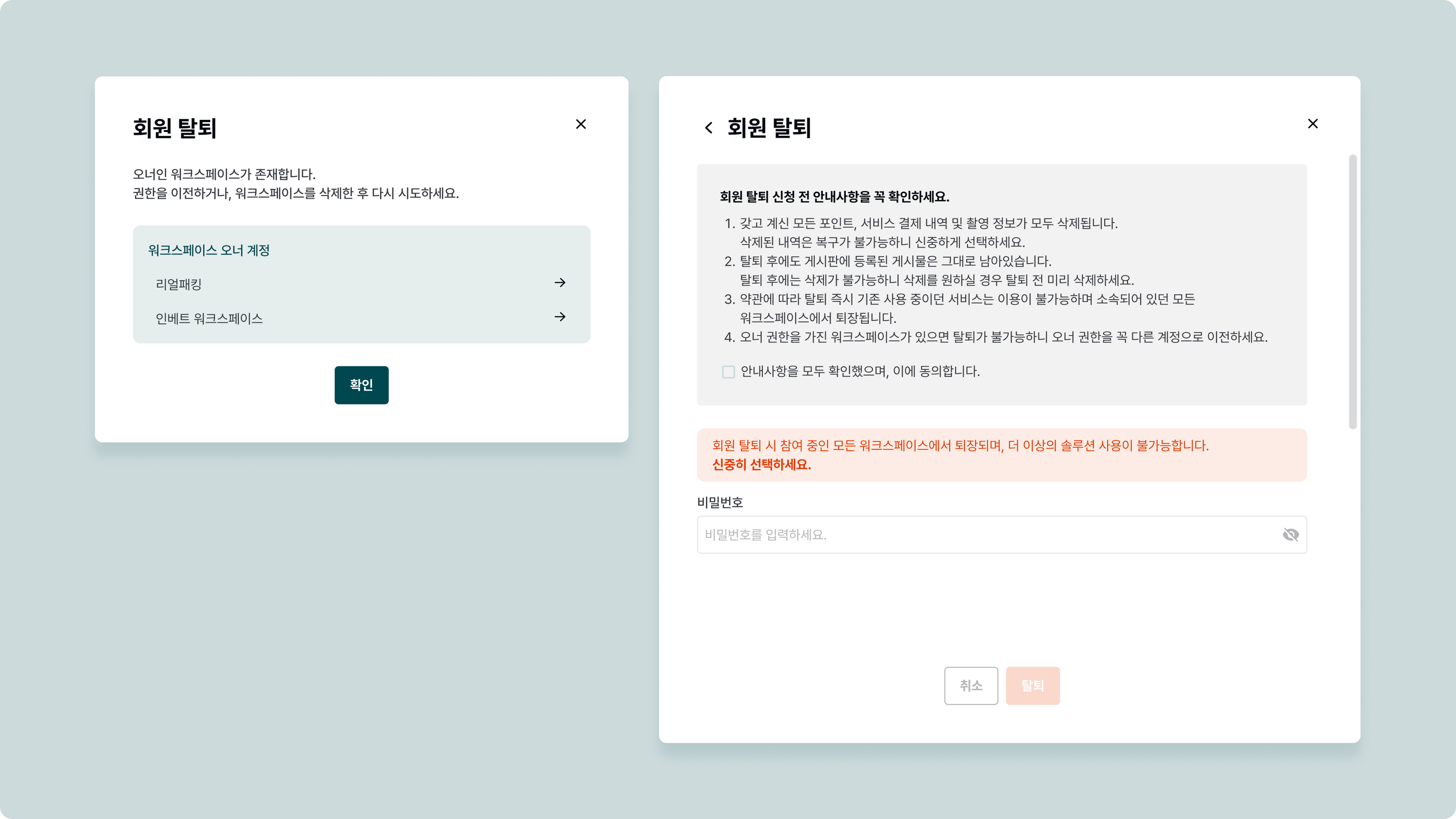 워크스페이스 오너는 오너 권한을 이전하거나, 워크스페이스를 삭제한 후 회원 탈퇴 합니다.