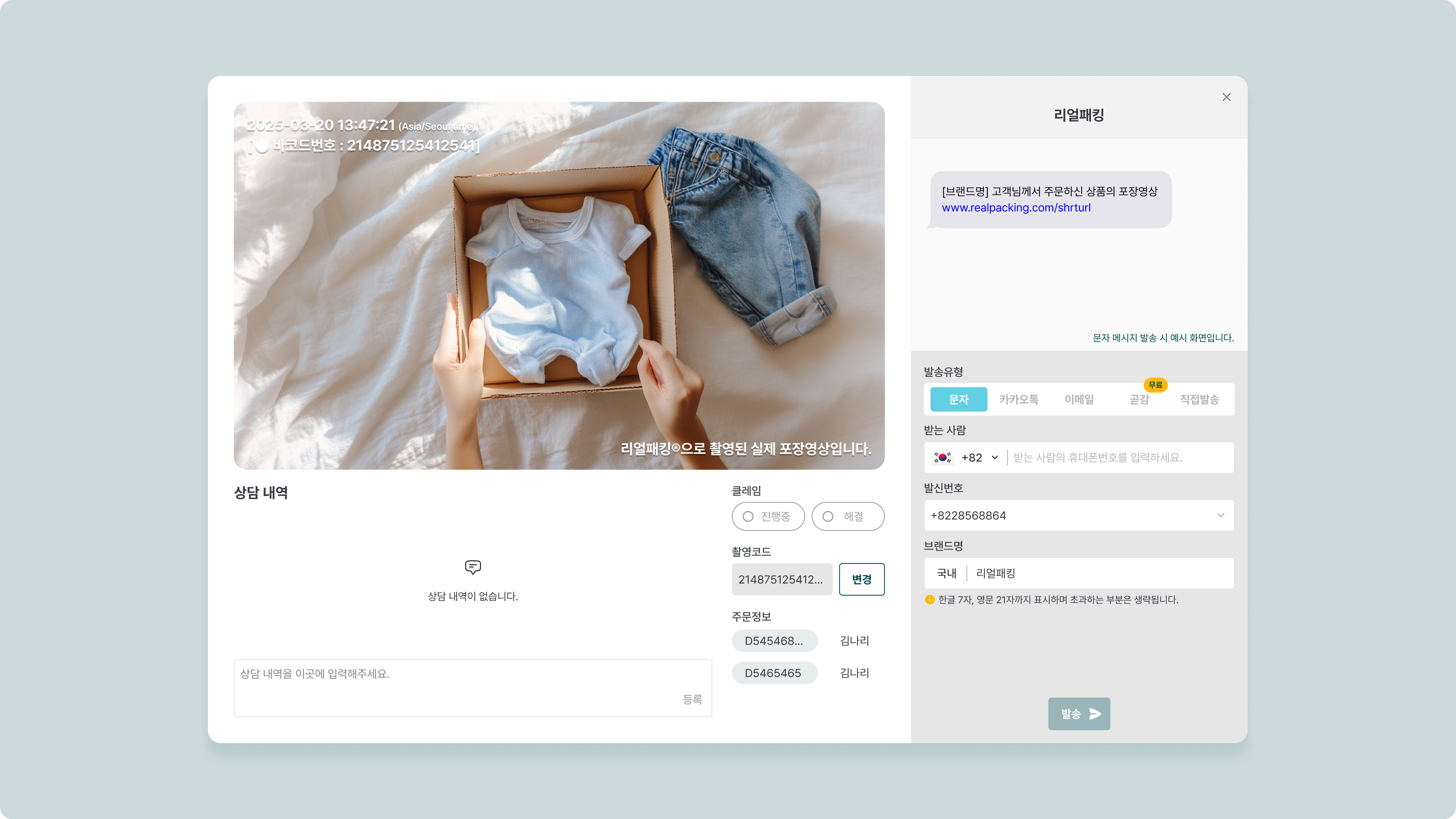 단건 발송 기능을 사용하면 한 사람의 고객에게 맞춤 영상을 전송하여 클레임을 신속하게 해결할 수 있습니다.