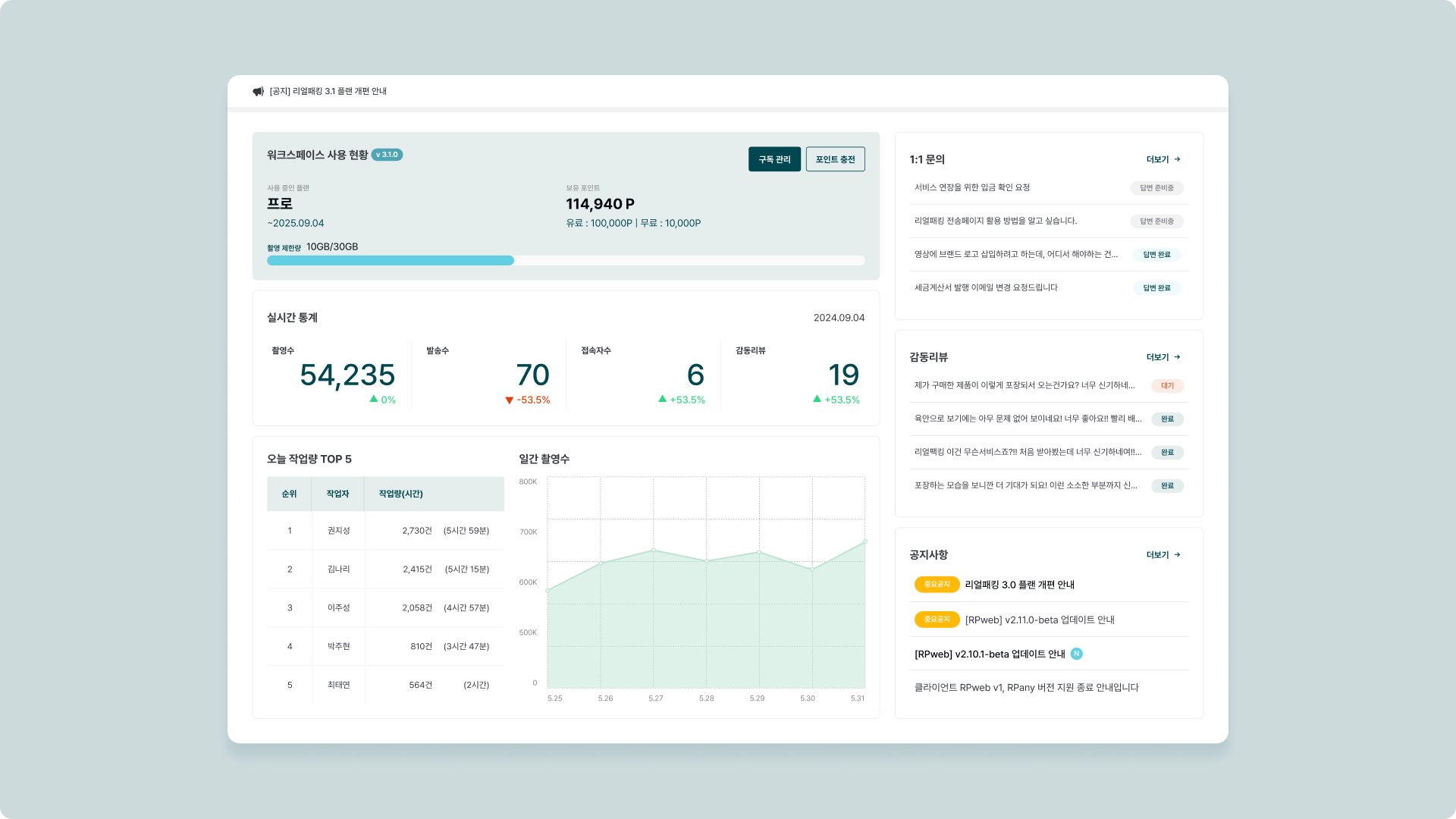 워크스페이스 사용 현황 사용중인 플랜, 포인트, 촬영 용량을 보여줍니다.