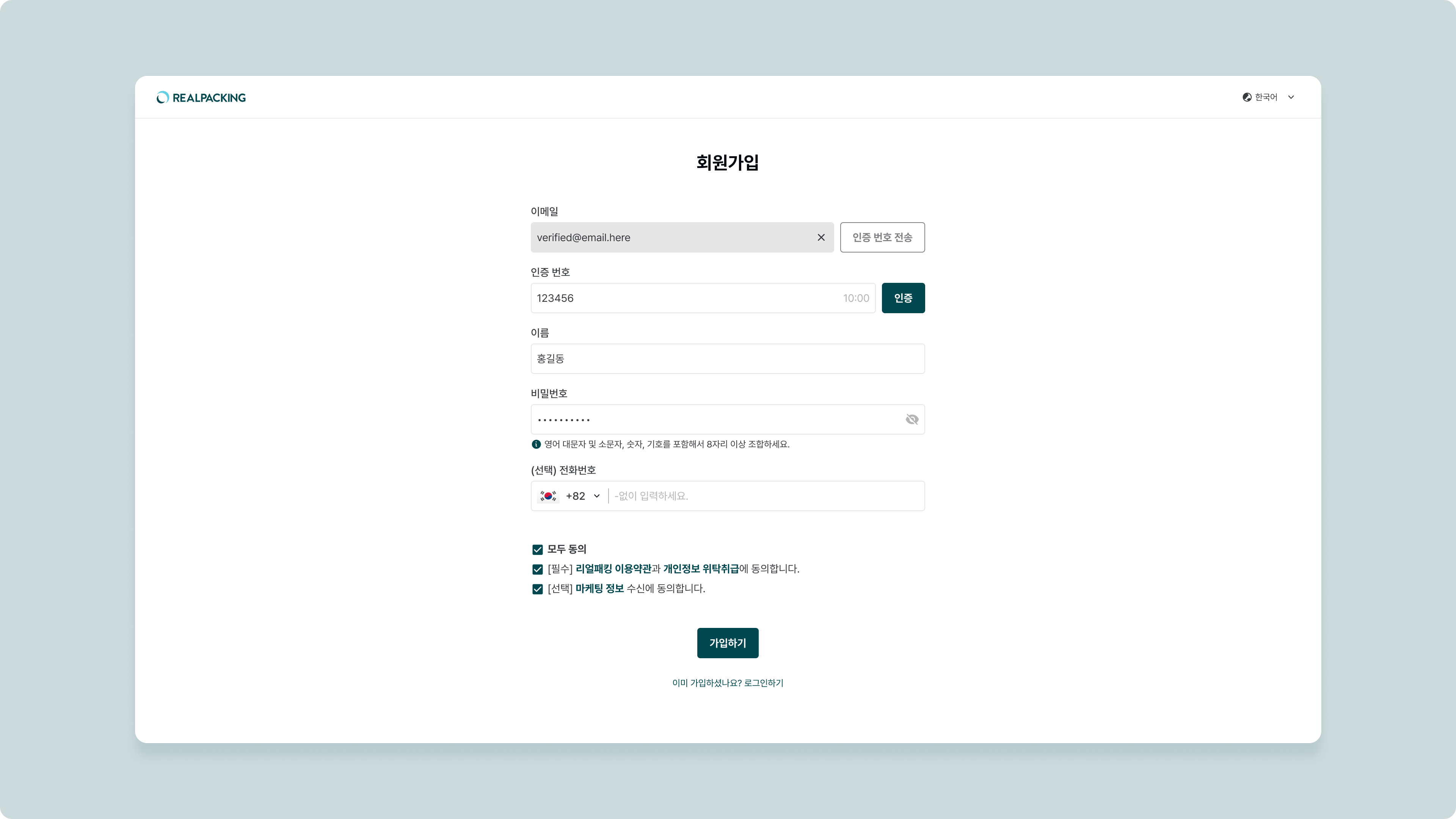 이메일로 수신한 인증번호로 인증을 완료하면 개인 회원 가입이 완료됩니다.