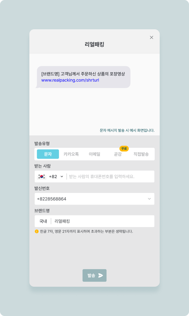 휴대폰 번호를 입력하고 발송합니다.고객의 휴대폰 번호에 SMS 문자 메시지로 영상의 링크가 발송됩니다.