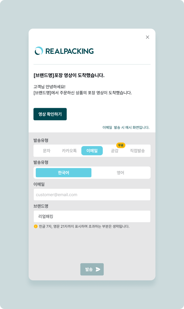 이메일을 입력하고 발송합니다.고객의 이메일에 영상의 링크가 발송됩니다.