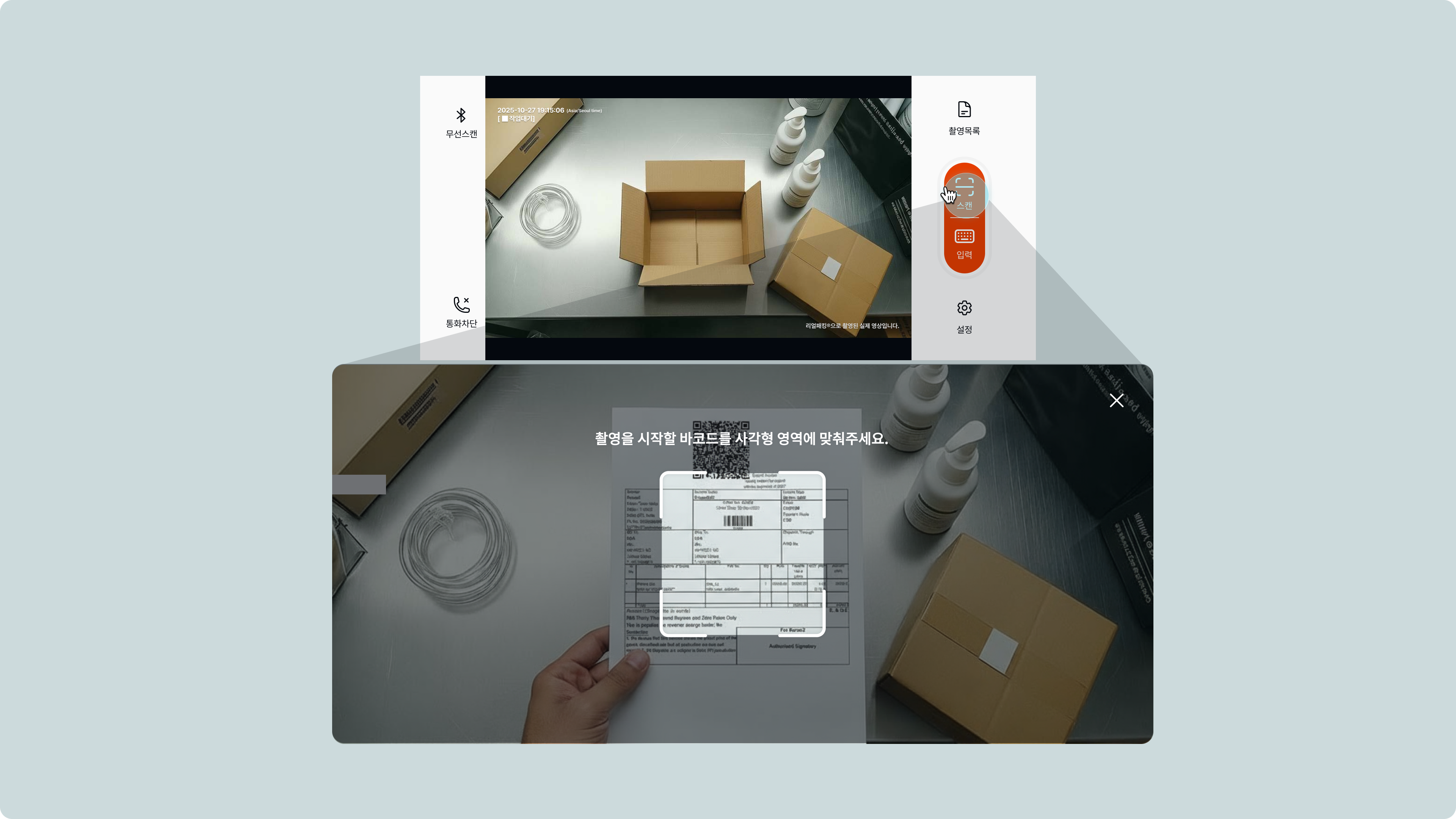 블루투스로 연결된 바코드 스캐너를 이용해, 바코드를 스캔하면 촬영이 시작됩니다.