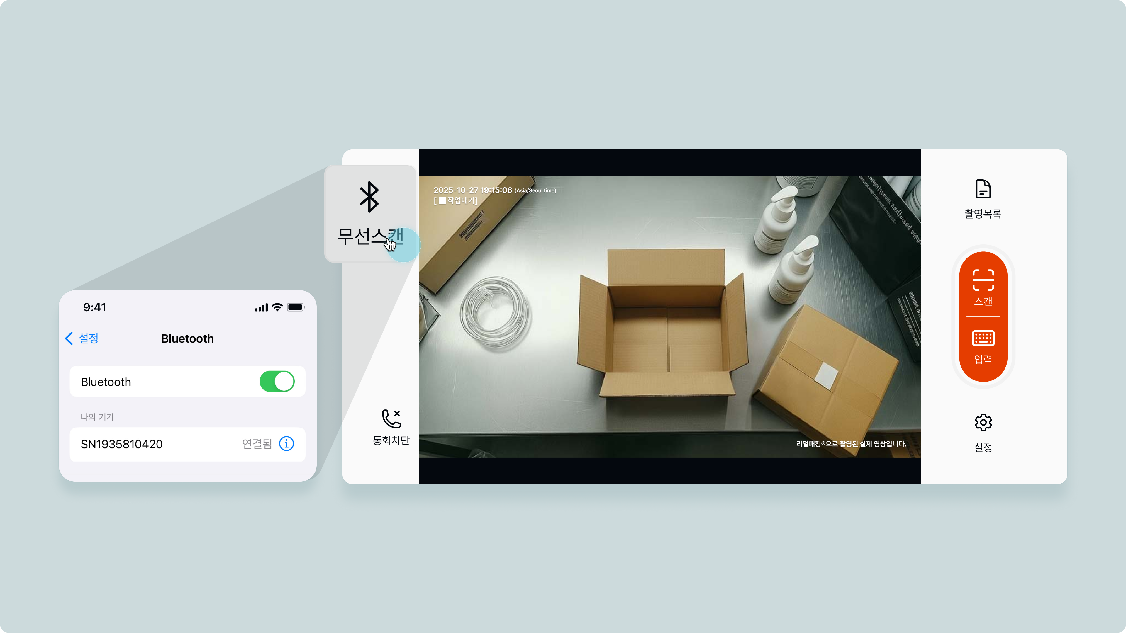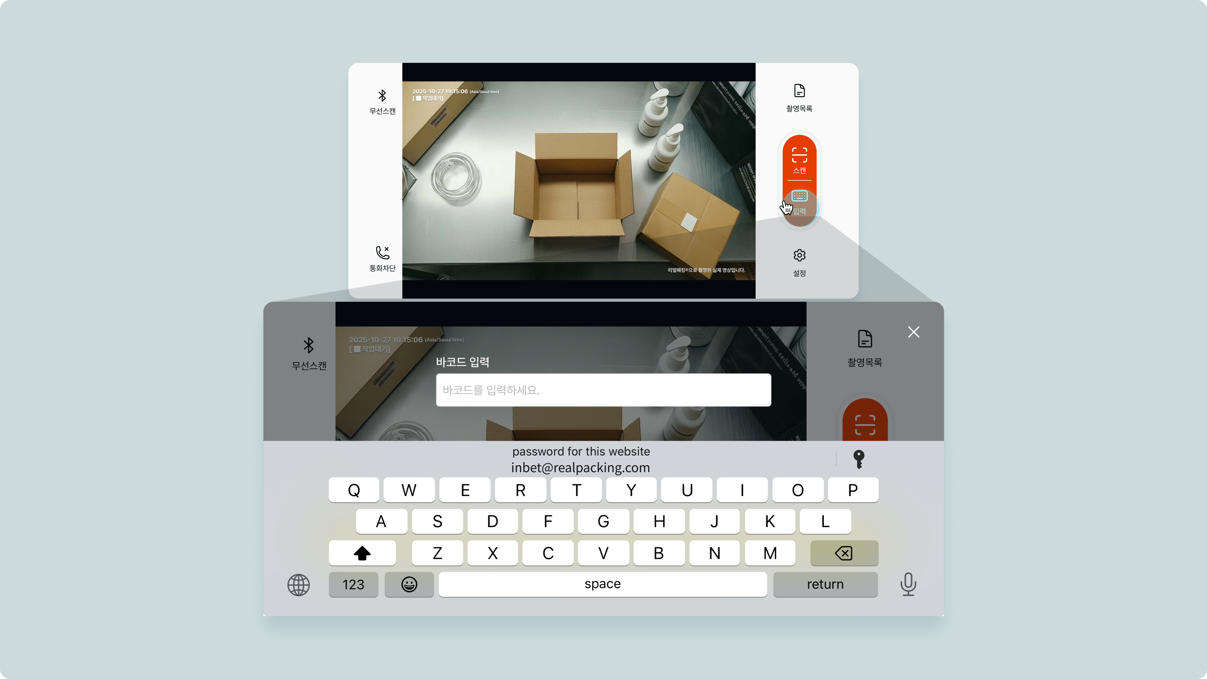 블루투스 바코드 스캐너 연결 → 바코드 입력 → 바코드 스캔(녹화시작)