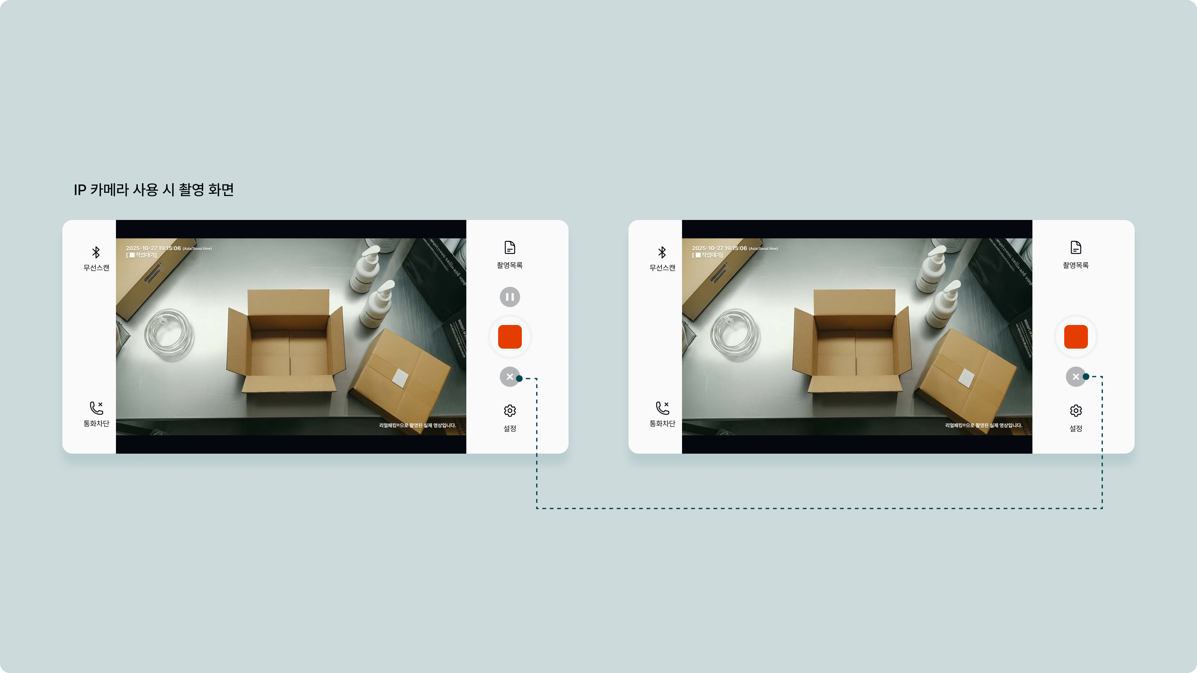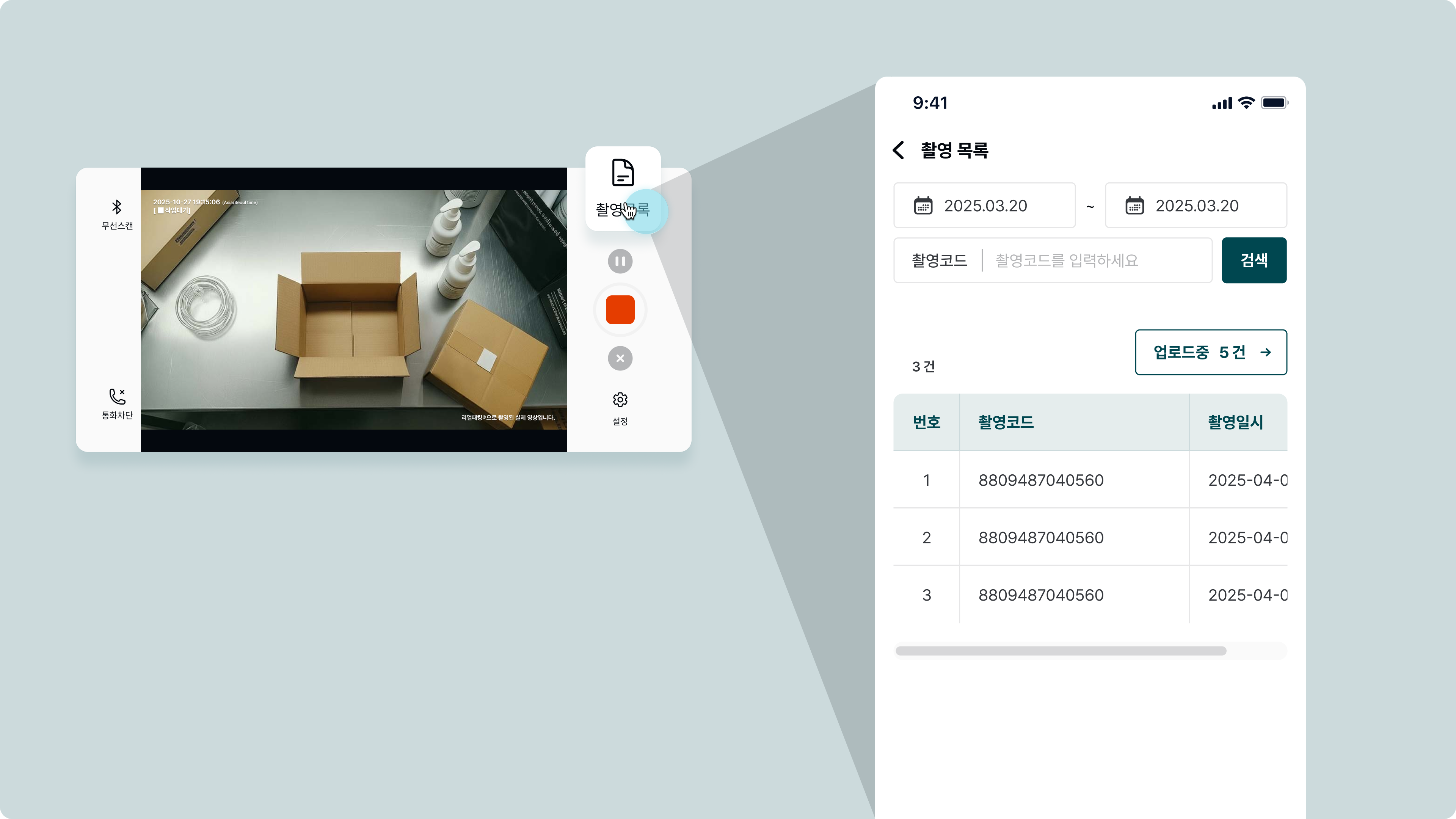 촬영시작 → 바코드 스캔(녹화시작) → 촬영완료(녹화종료 및 저장)