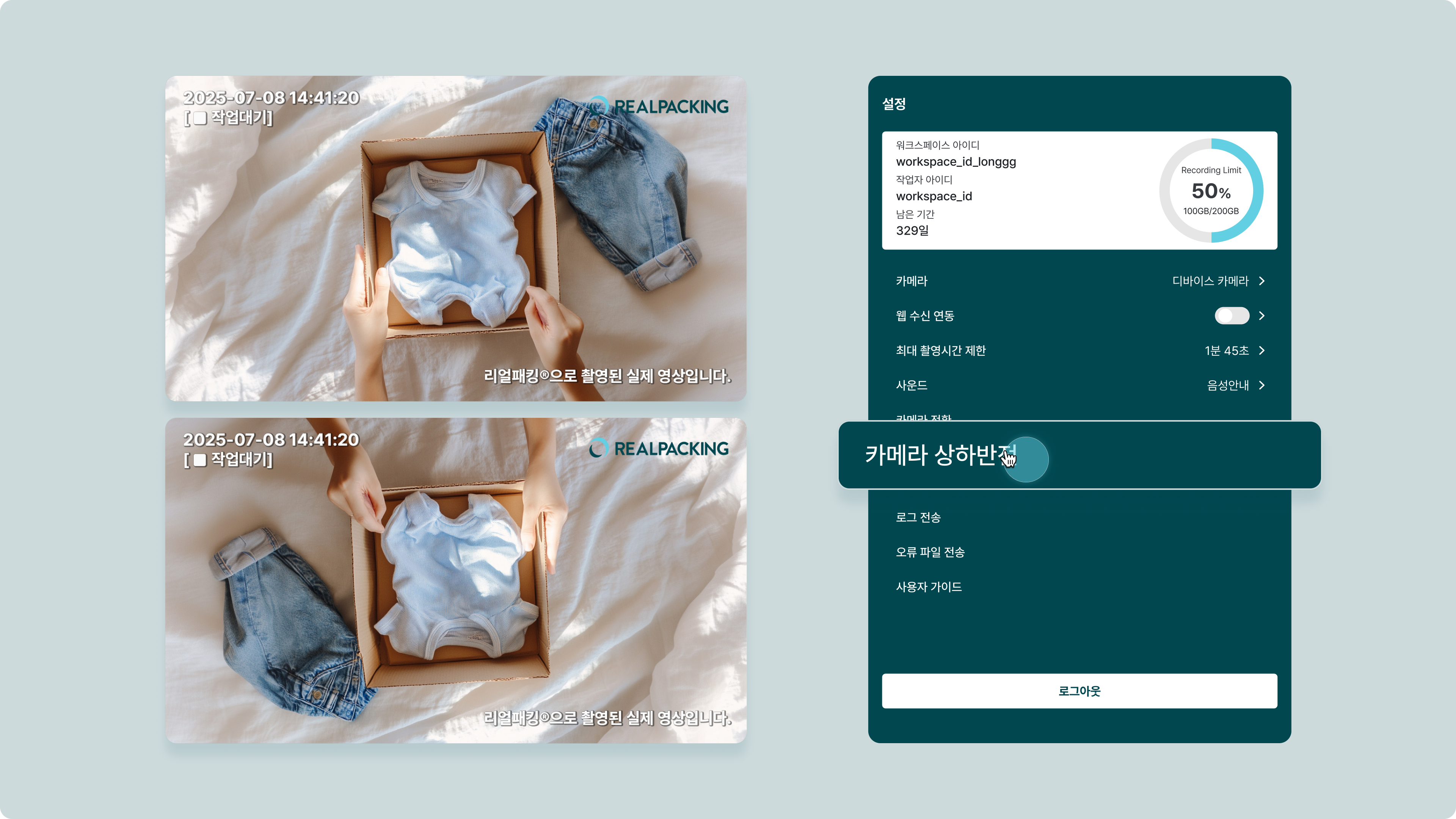 리얼패킹 앱은 고객이 주문한 제품의 포장 과정을 주문 건 별로 촬영하여 보관하거나 고객에게 전송할 수 있는 리얼패킹 솔루션의 모바일 버전입니다.