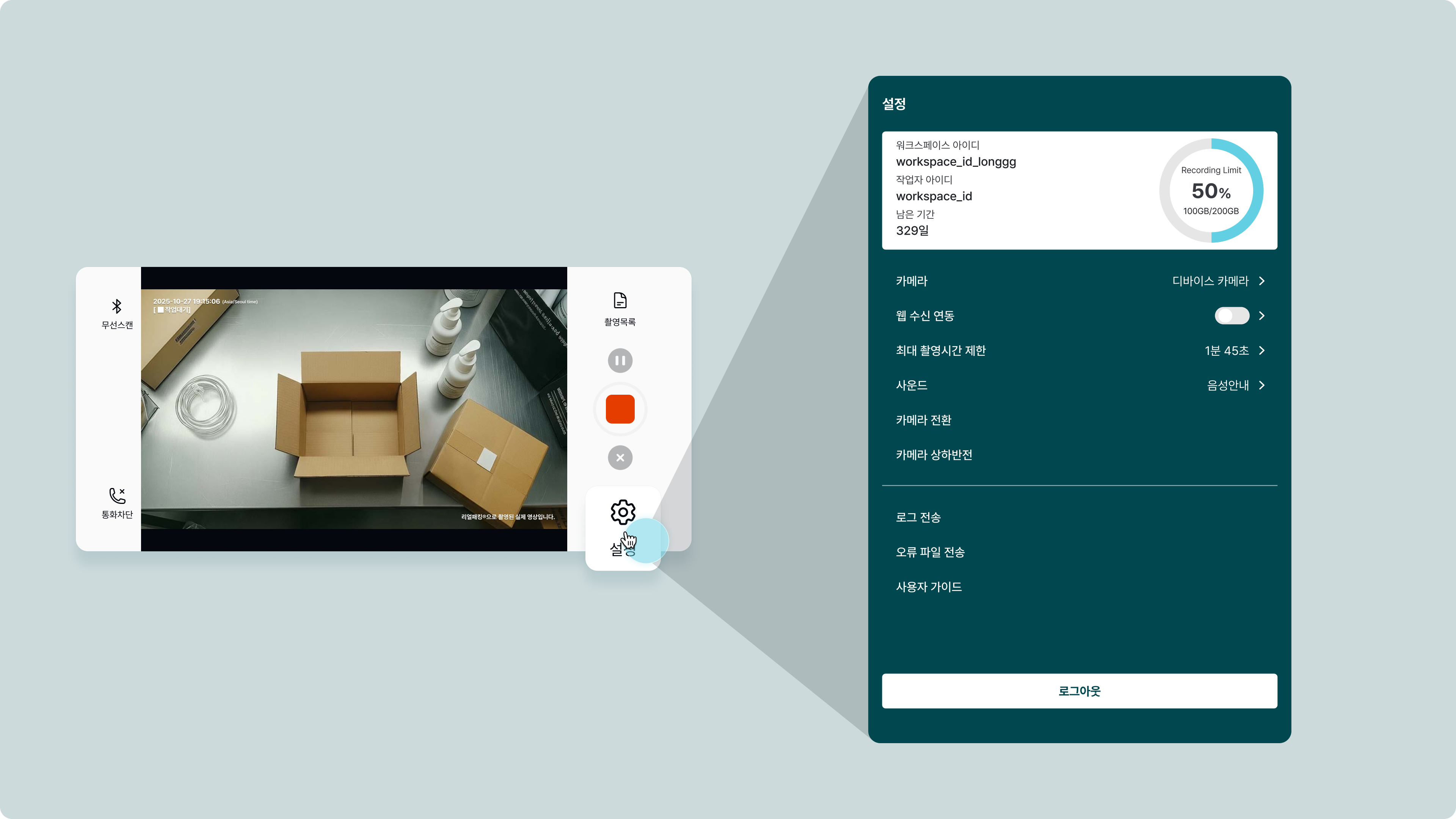 설정 메뉴에서 워크스페이스 아이디, 작업자 아이디, 남은 기간 및 촬영 용량을 확인합니다.