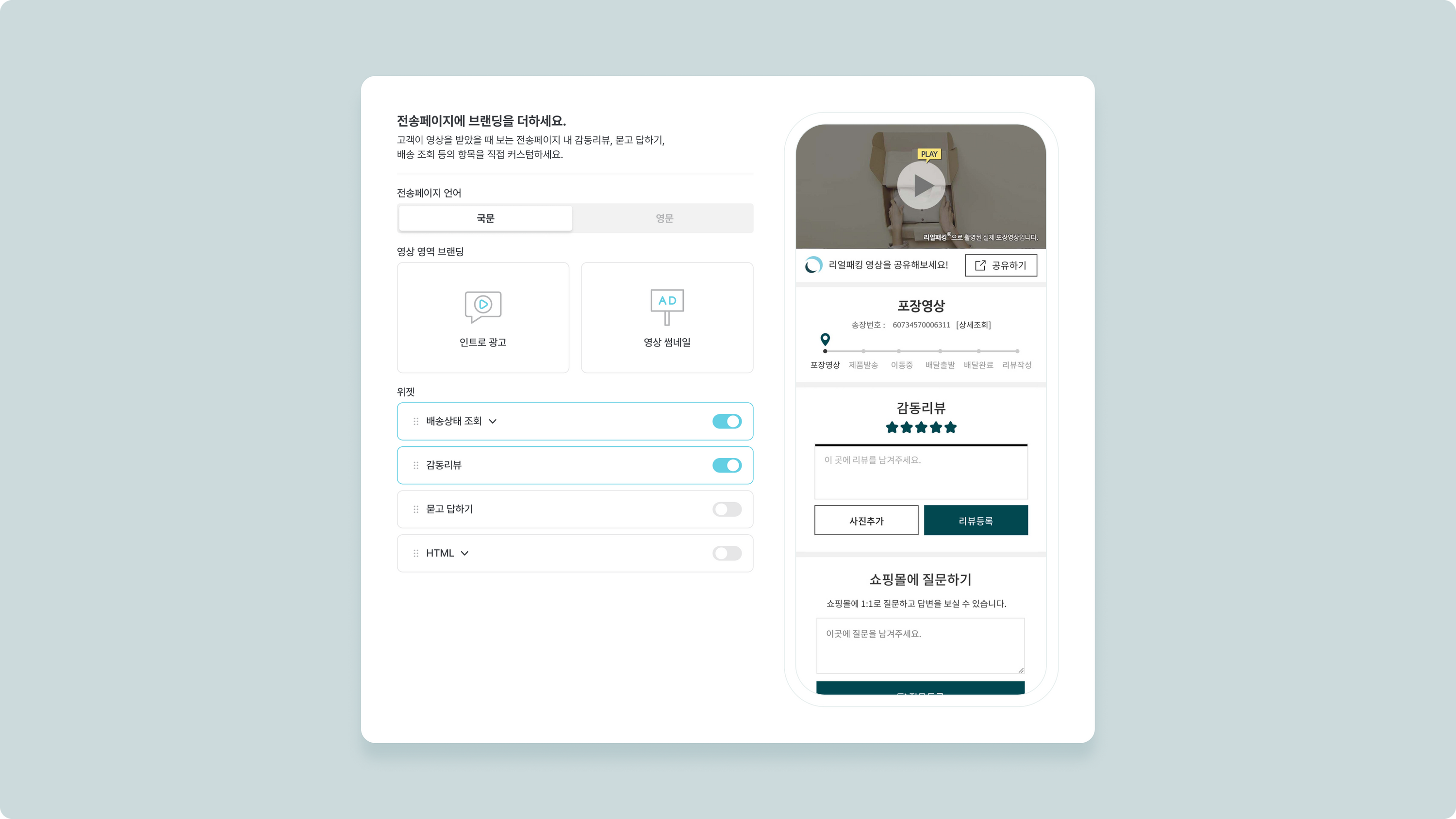 배송상태 조회 | 설정한 택배사와 촬영코드를 기준으로 배송 상태를 보여줍니다. 영문에는 배송상태 회 옵션이 제공되지 않습니다. |