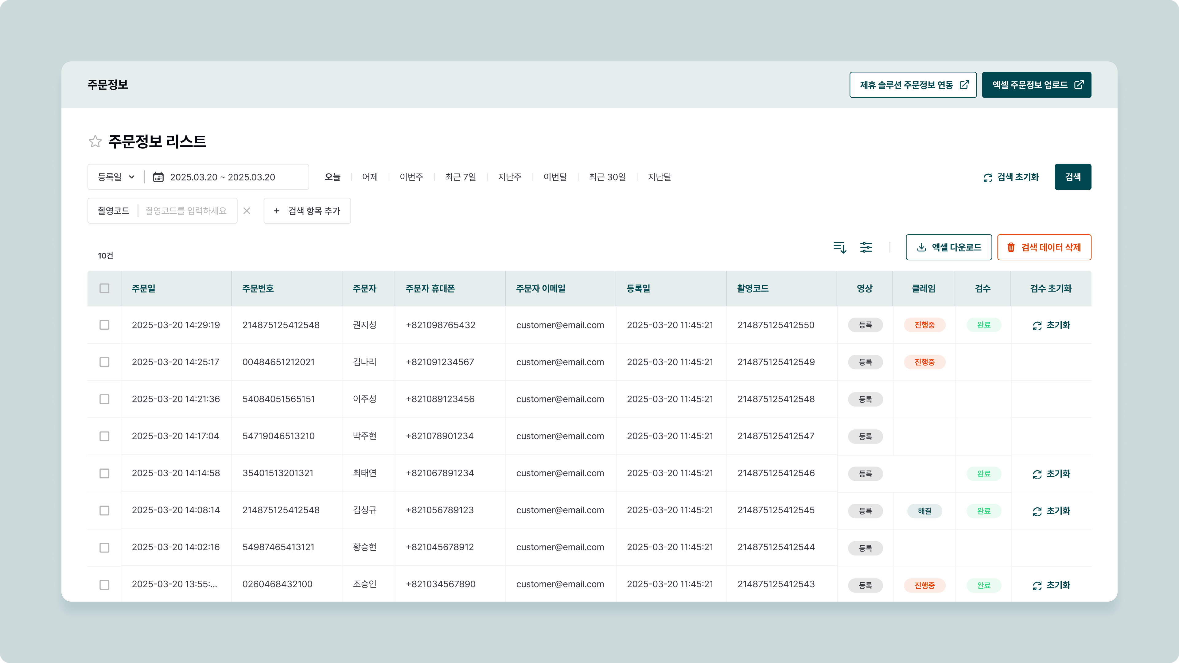 정렬과필터기능을 사용할 수 있습니다.다운로드기능을 통해, 촬영 정보 리스트를 엑셀 다운로드 하거나, 검수 결과를 다운로드 할 수 있습니다.검색 데이터 삭제로 주문 정보를 삭제합니다.주문 정보가 삭제되더라도 영상은 삭제되지 않습니다.
