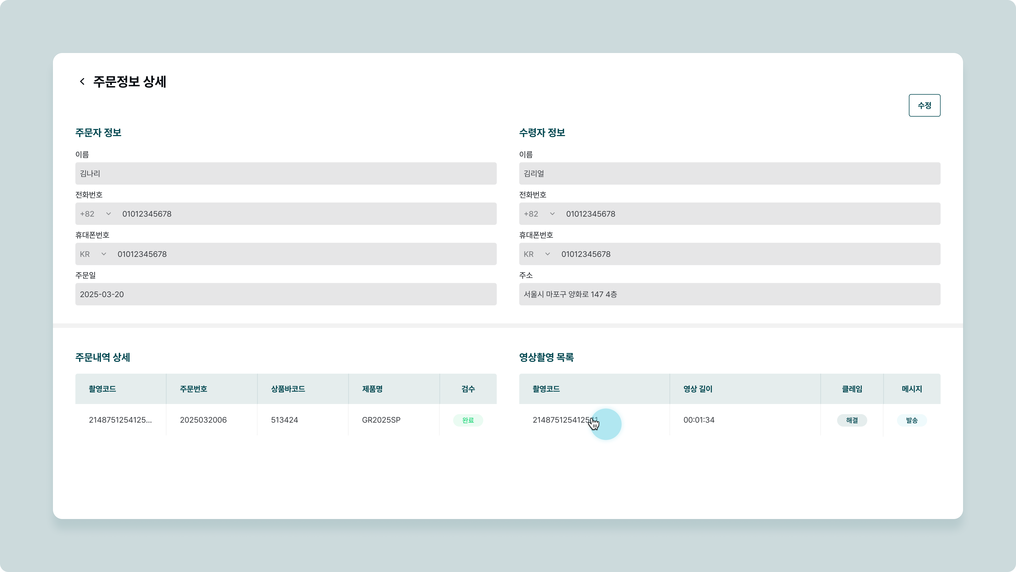 주문 정보 상세에서 주문 정보를 직접 수정할 수 있습니다.