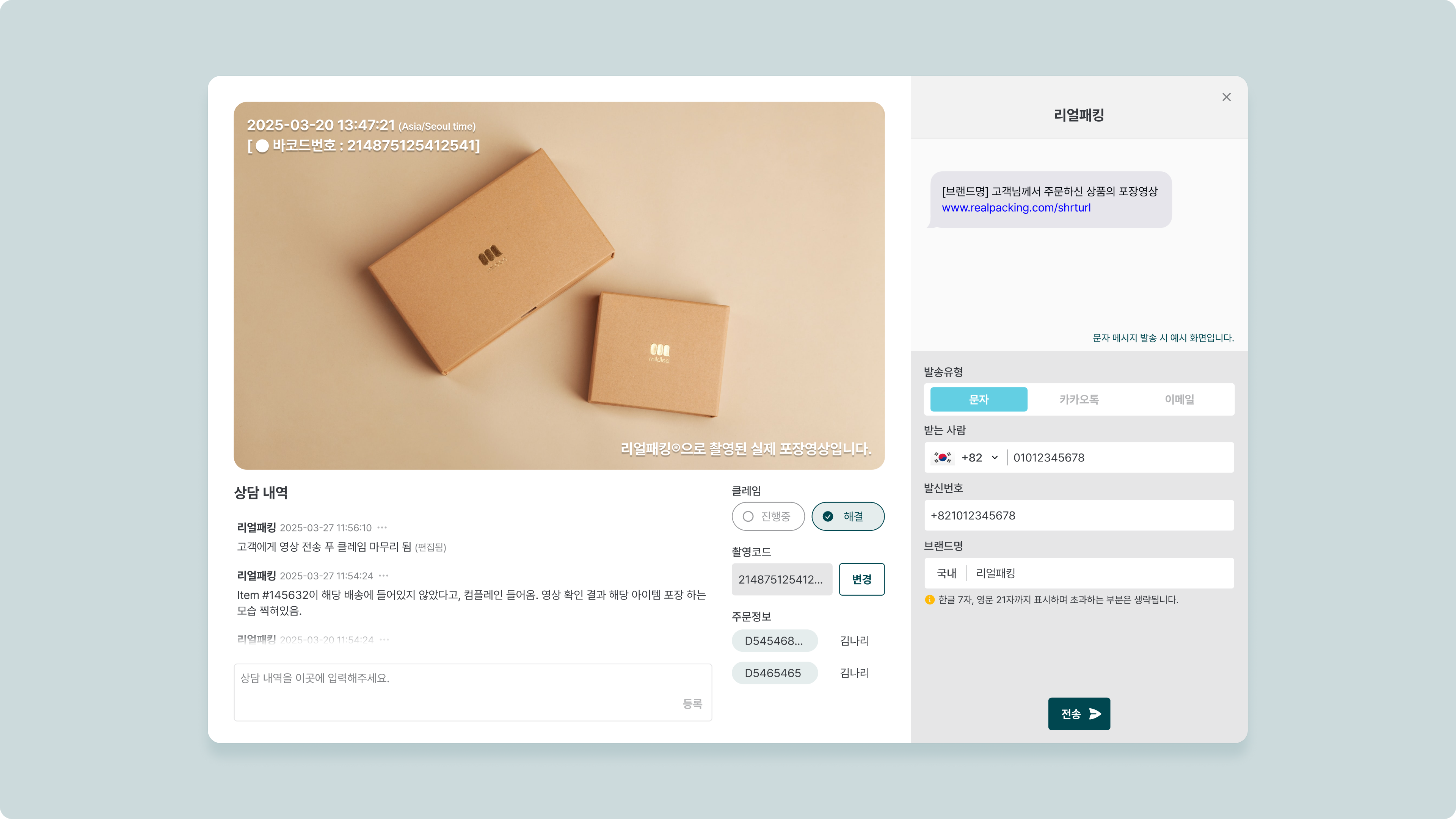 영상촬영 목록을 클릭하면, 해당 영상에 대한 클레임(상담내역)을 등록하거나, 영상을 고객에게 전송 할 수 있습니다.영상 발송은 단건 발송 페이지에서 확인합니다.