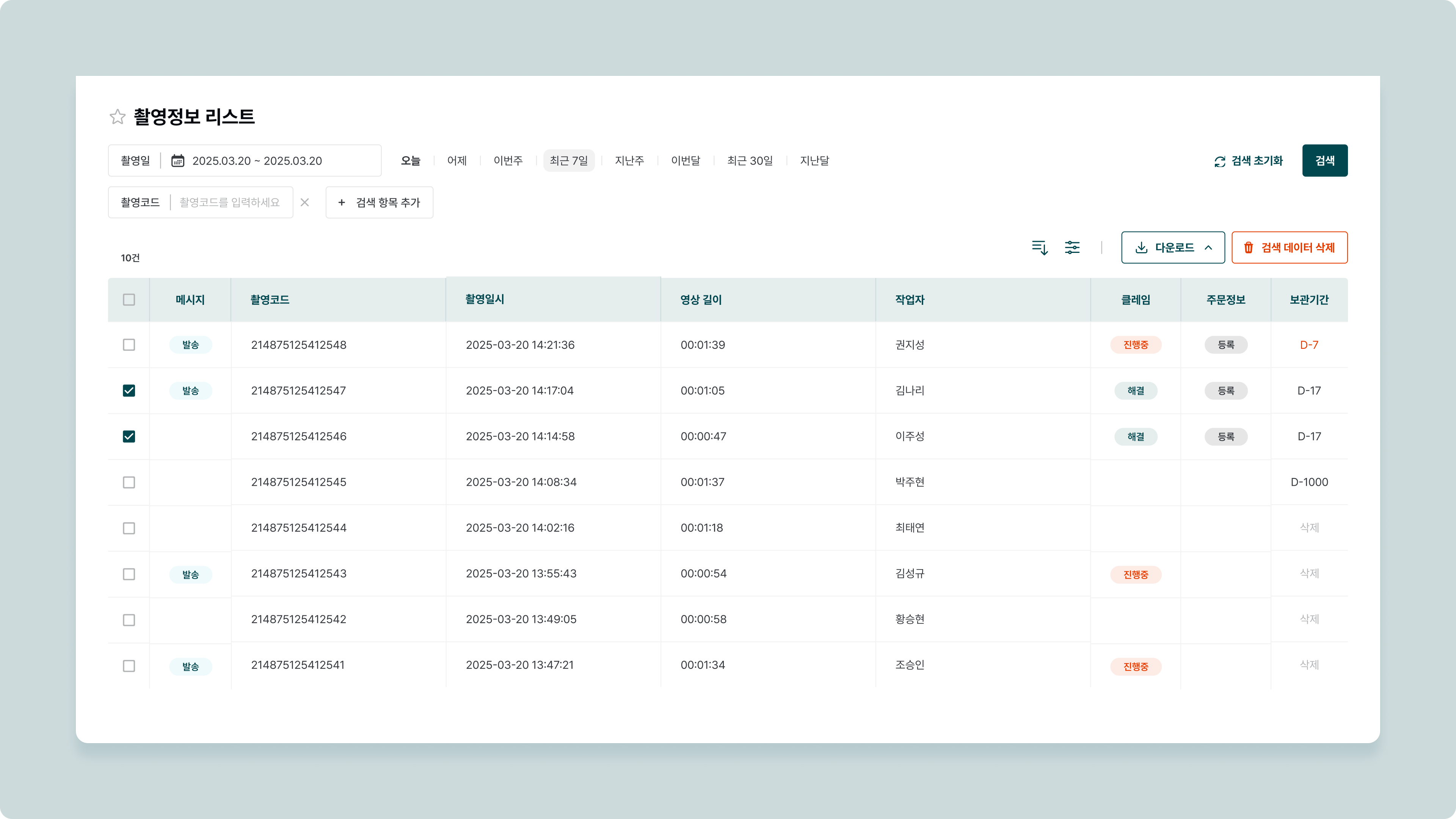 정렬과필터기능을 사용할 수 있습니다.다운로드기능을 통해, 촬영 정보 리스트를 엑셀로 다운로드 하거나, 검수 결과를 다운로드 할 수 있습니다.검색 데이터 삭제로 촬영 영상을 워크스페이스에서 삭제합니다.플랜 옵션에서 선택한 보관 기간이 경과한 영상은 자동 삭제 됩니다.