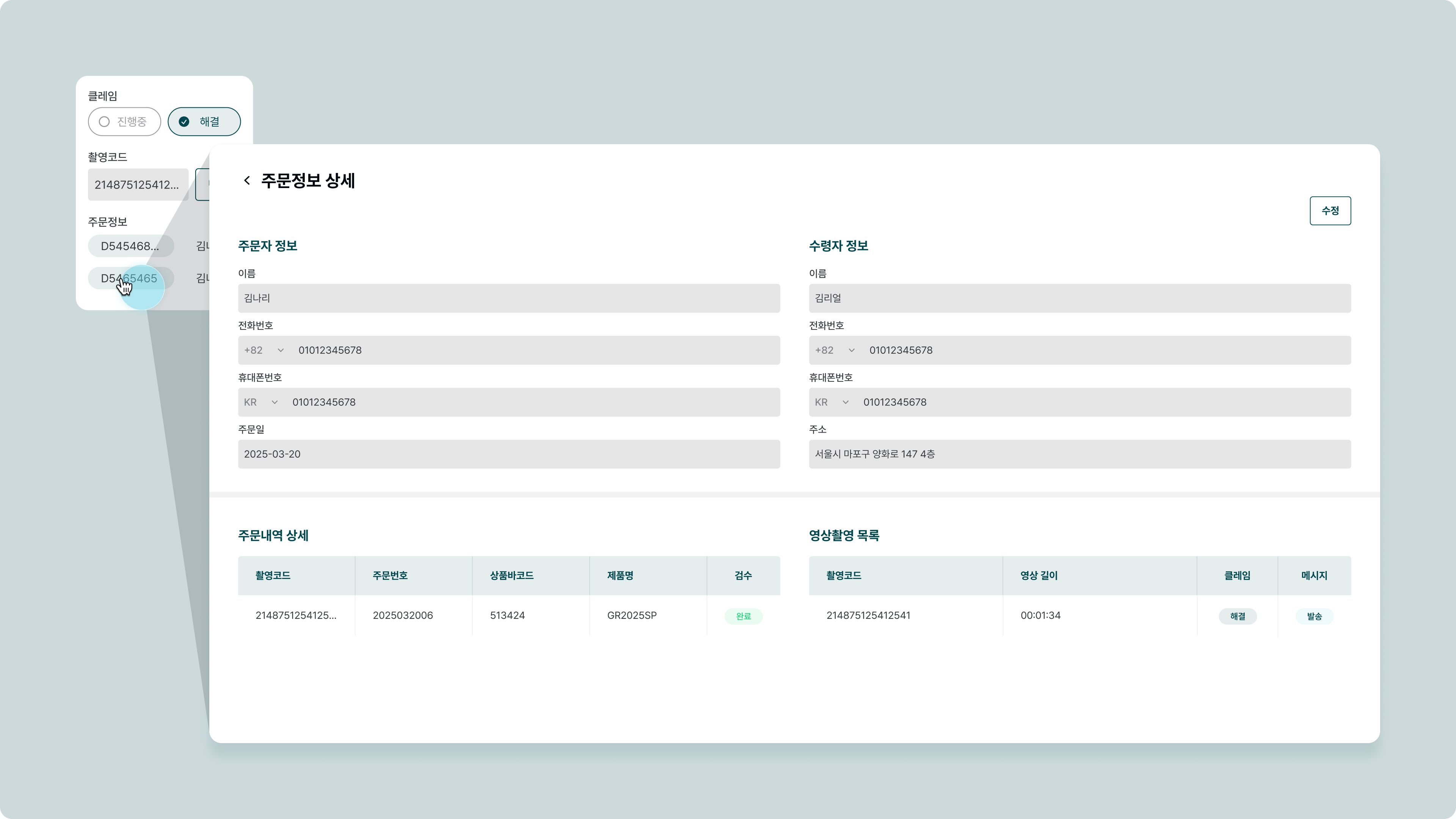 클레임항목에서진행중을 체크하고, 해결된 이후해결상태로 변경 합니다.해당 영상을 고객에게 발송합니다. 단건 발송 페이지에서 자세한 내용을 확인합니다.