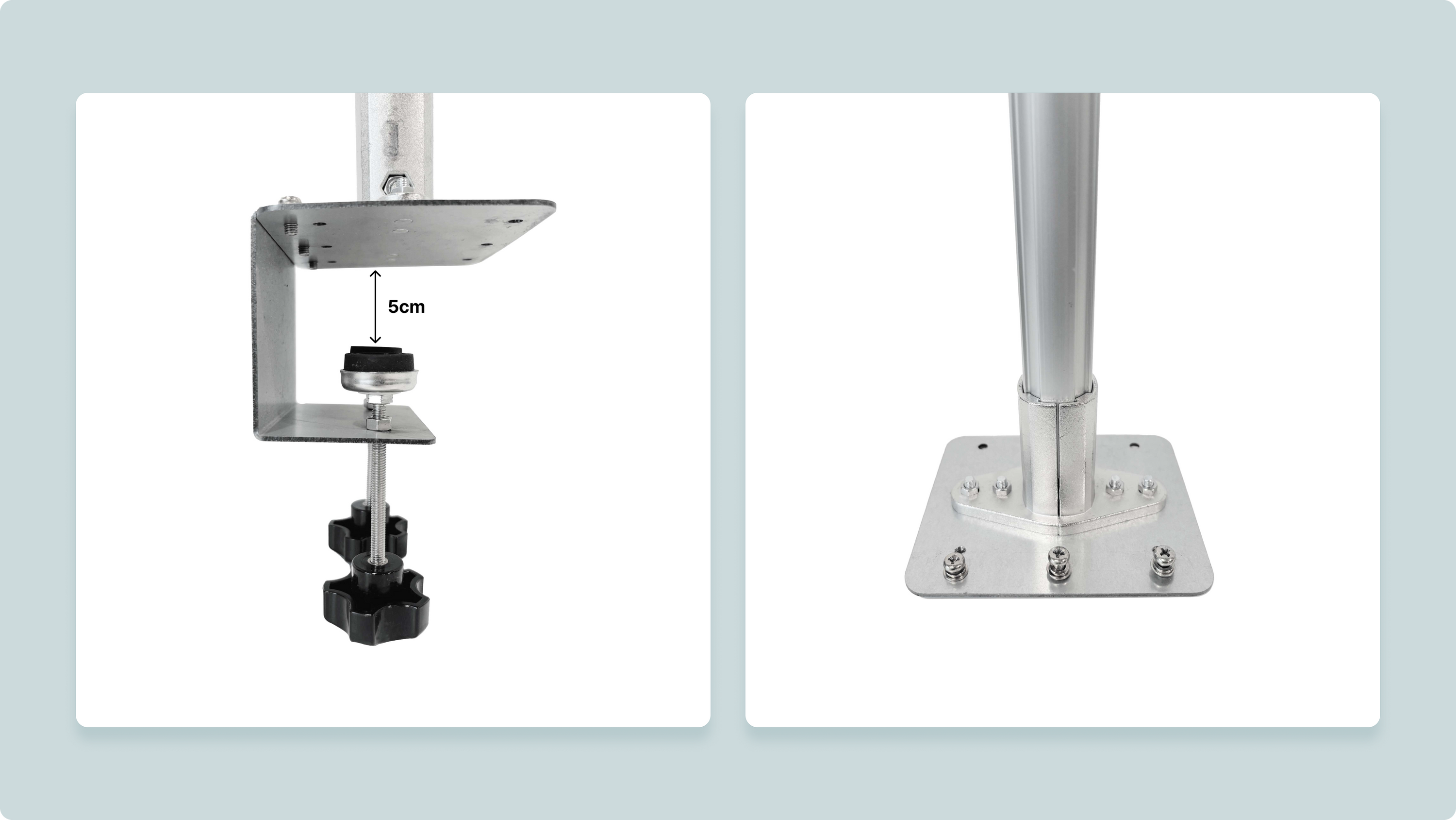거치대 클램프의 넓이는 볼트 두께를 제외 하고 약 5cm 정도입니다. 작업대의 두께가 5cm 이상이면, 클램프를 제거하고 작업대 상판에 나사와 드릴로 고정하세요.