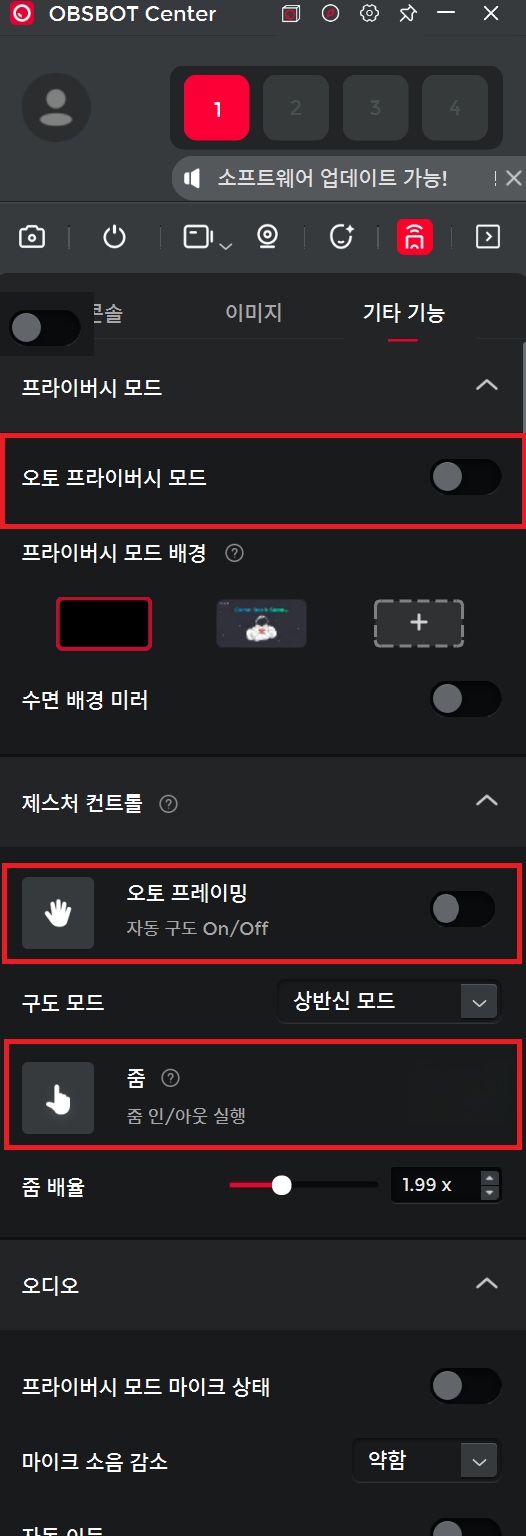 옵스봇 센터 > 기타기능 에서 '오토 프라이버시', '오토프레이밍', '줌' 모드를 해제 (OFF)합니다.
