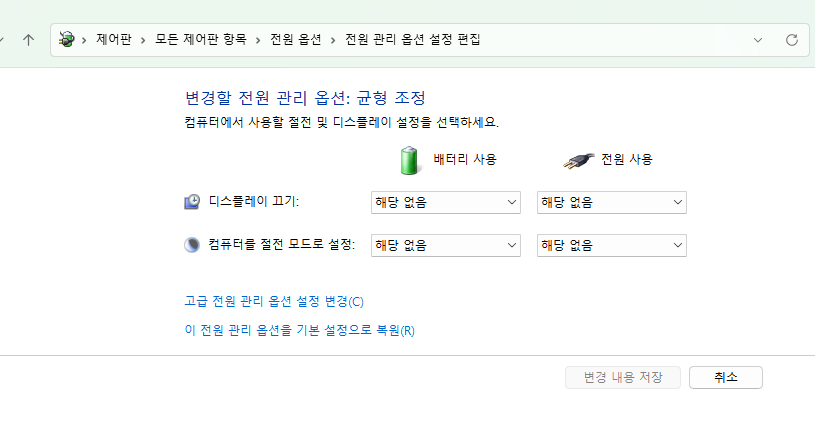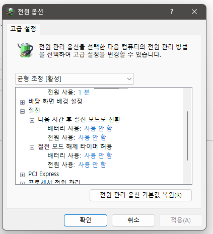컴퓨터 전원 옵션의 절전 관련 모드를 해제합니다.
