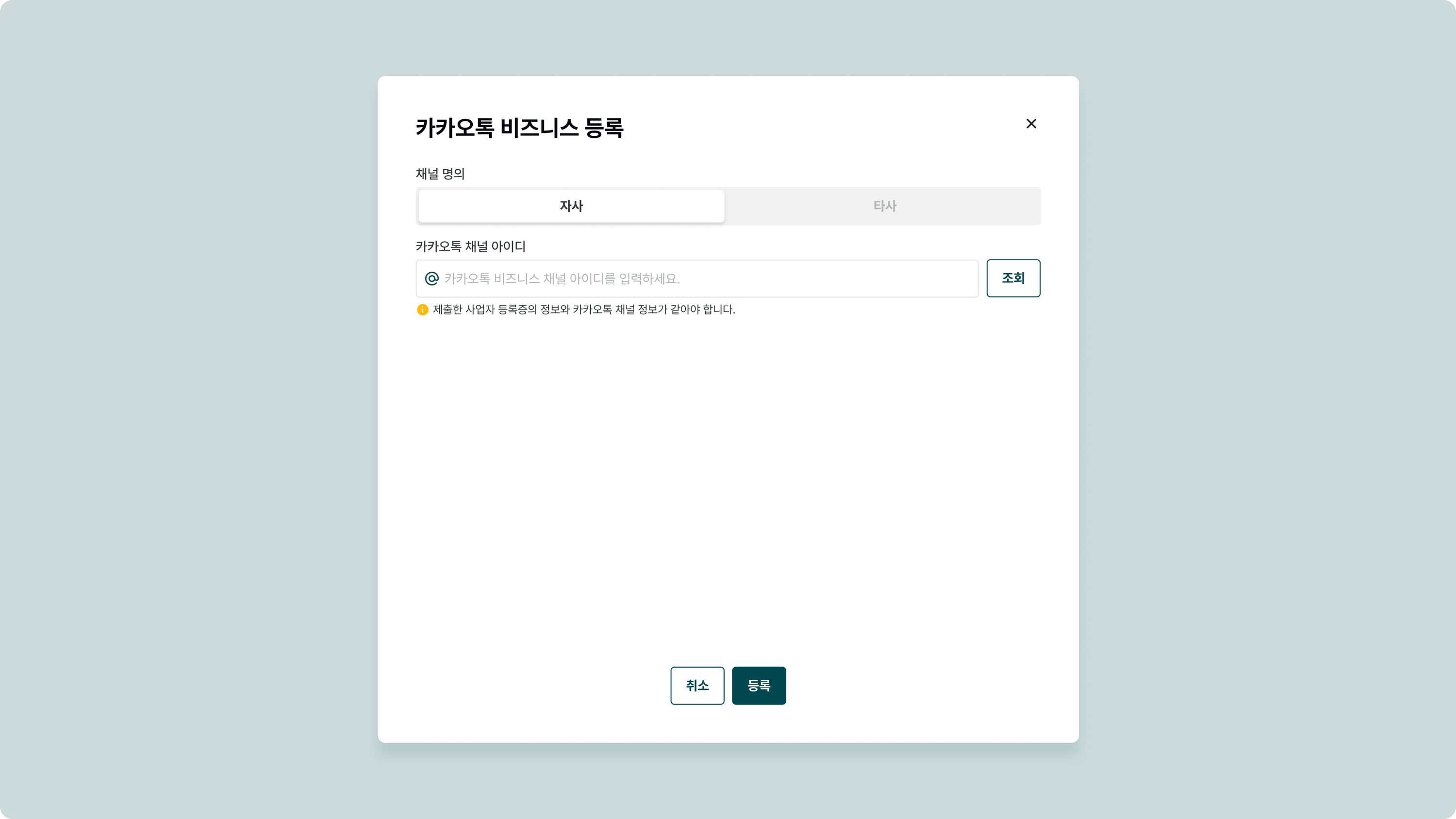 제출한 사업자 등록증의 정보와 카카오톡 채널 정보가 같아야 합니다.