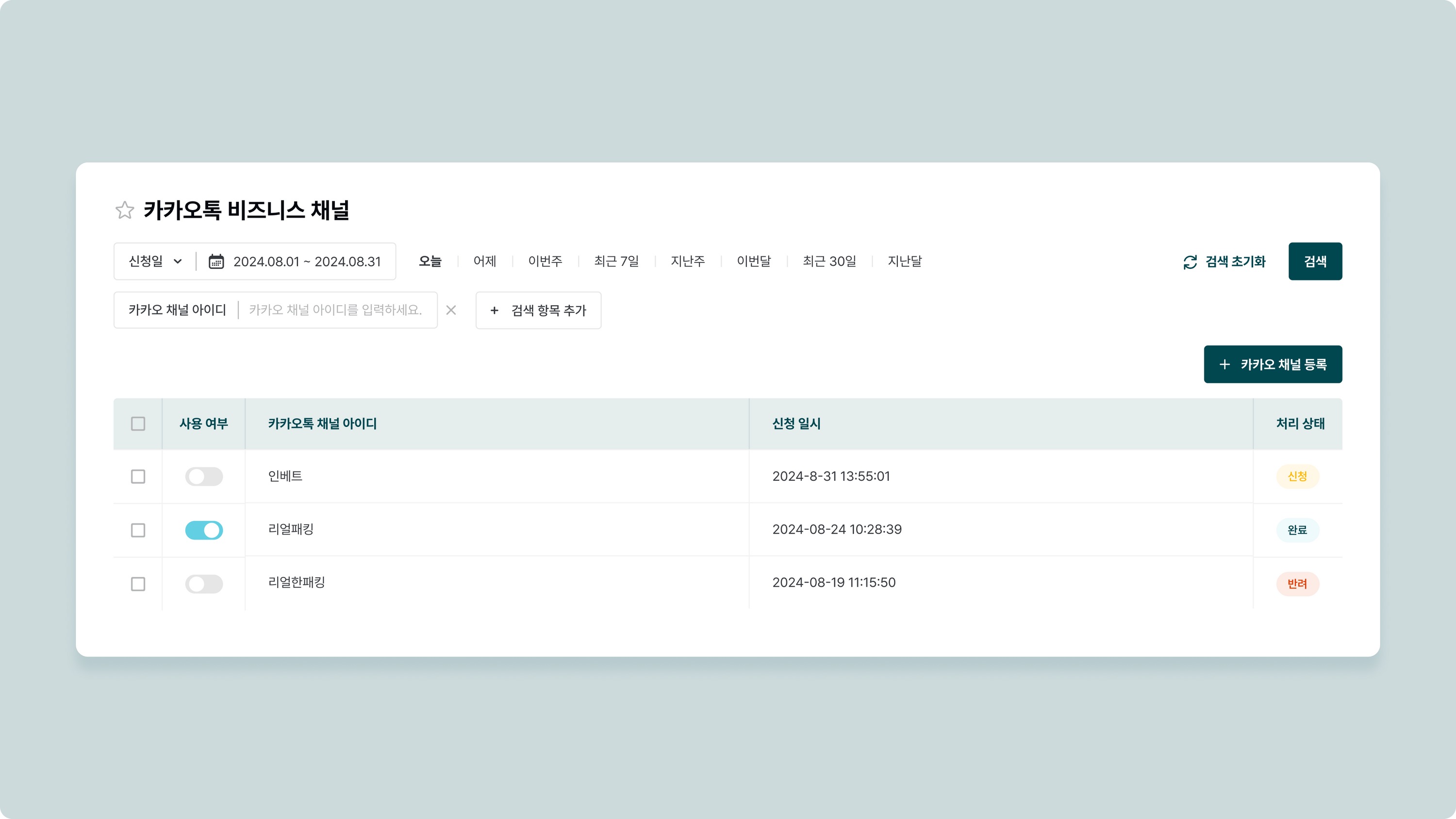 처리 상태 | 신청 : 운영자가 채널 아이디를 심사 중입니다. 완료 : 심사가 완료되어 사용 가능합니다. 반려 : 반려 사유를 확인한 후 재신청 합니다. |