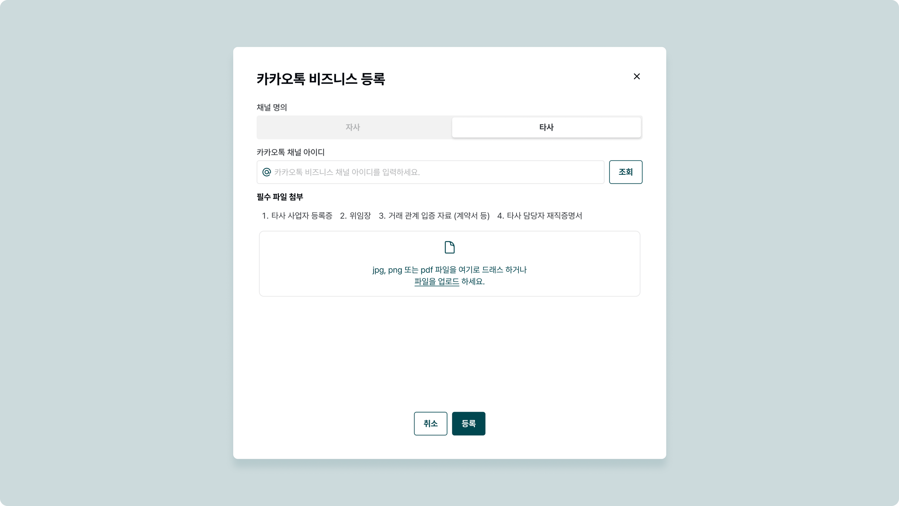 타사의 채널 아이디 등록을 입증하는 필요한 서류를 첨부합니다.