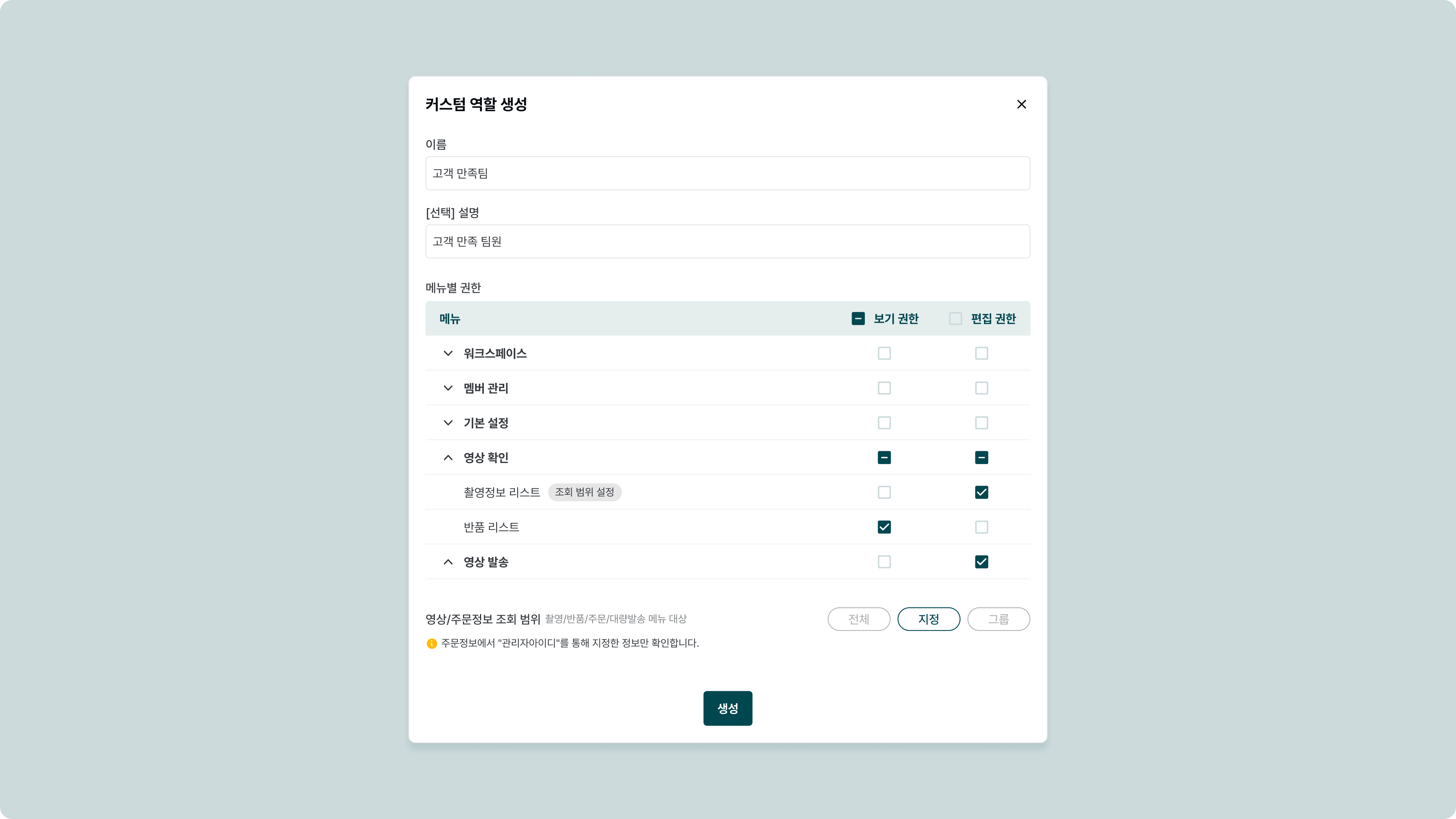 CS팀, 물류팀 등 각 부서별 관리자가 모든 영상과 주문정보를 제한 없이 볼 수 있도록 커스텀 역할을 설정합니다.
